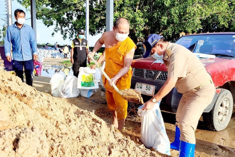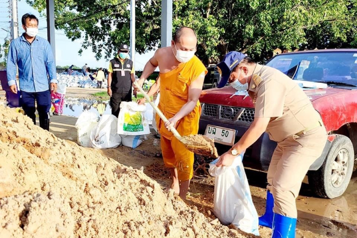 พระวัดโบสถ์ย่านซื่อ จ.อ่างทอง น้ำก็จะเข้าวัด ทรายก็จะกรอก ผีก็จะเผา ข้าวก็จะผัด ช่วยกันกรอกทรายเพื่อทำผนังเขื่อนไม่ให้น้ำเข้าวัด