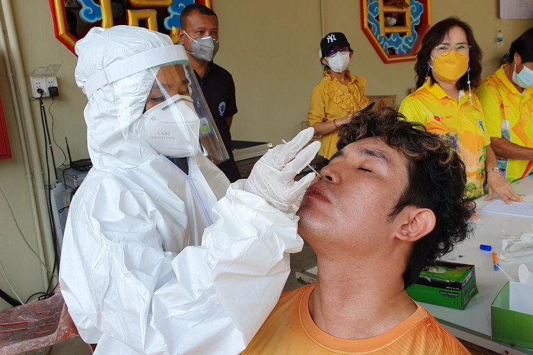ผู้สื่อข่าวรายงาน ที่ศาลเจ้าบุนเท่าก๋ง หมู่ 3 ต.คึกคัก อ.ตะกั่วป่า จ.พังงา หลังจากที่ทางจังหวัดได้มีการออกคำสั่งป้องกันโควิด-19 ในช่วงเทศกาลถือศีลกินผัก 2564 ให้แต่ละศาลเจ้างดแสดงอภินิหาร ทิ่มแทงร่างกาย ลดพิธีกรรมในงานประจำปี โดยปีนี้ศาลเจ้าบุนเท่าก๋งได้จัดพิธีถือศีลกินผักขึ้น ระหว่างวันที่ 5-14 ตุลาคม 2564 นายสิริธร บัวแก้ว รองนายกองการบริหารตำบลคึกคัก พร้อมด้วยเจ้าหน้าที่โรงพยาบาลส่งเสริมสุขภาพตำบลคึกคัก เจ้าหน้าที่ อสม ร่วมกันตรวจตรวจ (Antigen Test Kit) ATK ม้าทรงและพี่เลี้ยง ผู้ที่จะเข้าร่วมประกอบพิธีกรรมและพ่อค้าแม่ค้าที่ขายอาหารบริเวณศาลเจ้า ก่อนเริ่มประเพณีถือศีลกินผักที่จะเริ่มพิธียกเสาโกเต้งขึ้นในวันพรุ่งนี้ โดยมีม้าทรง พี่เลี้ยง พ่อค้าแม่ค้าที่ร่วมตรวจ ATK จำนวน 37 คนซึ่งทุกคนมีผลเป็นลบ