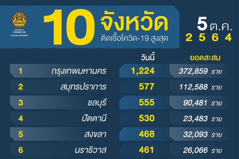เมื่อวันที่ 5 ต.ค่.64 ศูนย์ข้อมูลโควิด-19 รายงานสถานการณ์โรคติดเชื้อไวรัสโควิด-19 ข้อมูล ณ วันที่ 5 ต.ค.64 พบผู้ติดเชื้อรายใหม่ใน 76 จังหวัด โดยมีเพียงจ.น่าน ที่ไม่พบผู้ติดเชื้อรายใหม่ กทม.ยังพบผู้ติดเชื้อรายใหม่มากที่สุด 1,224 ราย แม้จะลดลงแต่ยังสูงที่สุดในไทย ตามด้วย สมุทรปราการ ที่วันนี้เป็นอันดับ 2 ชลบุรี อันดับ 3 ส่วนยะลา ที่อยู่อันดับ 2 รวม 3 วันติดต่อกัน มาวันนี้อยู่อันดับที่ 8 โดยภา+ใต้ติดท็อปเทน 5 จังหวัด ขณะมี 26 จังหวัดที่พบผู้ติดเชื้อรายใหม่เกินร้อย สูงสุดที่ภาคใต้ ภาคใต้ พบผู้ติดเชื้อรายใหม่เกินร้อยใน 9 จังหวัดได้แก่ ปัตตานี สงขลา นราธิวาส นครศรีธรรมราช ยะลา สุราษฎร์ธานี กระบี่ ภูเก็ต และชุมพร ภาคกลาง พบผู้ติดเชื้อรายใหม่เกินร้อยใน 7 จังหวัดได้แก่ กทม. สมุทรปราการ สมุทรสาคร นนทบุรี พระนครศรีอยุธยา นครปฐม และสระบุรี ภาคตะวันออก พบผู้ติดเชื้อรายใหม่เกินร้อยใน 4 จังหวัด คือ ชลบุรี ระยอง ปราจีนบุรี จันทบุรี ภาคตะวันออกเฉียงเหนือ พบผู้ติดเชื้อรายใหม่เกินร้อยใน 3 จังหวัด คือ อุดรธานี นครราชสีมา และขอนแก่น ภาคตะวันตก พบผู้ติดเชื้อรายใหม่เกินร้อยใน 3 จังหวัด ราชบุรี ตาก กาญจนบุรี ส่วนภาคเหนือ ผู้ติดเชื้อรายใหม่ยังคงไม่เกินร้อย มีเพียงเชียงใหม่ที่รายใหม่อยู่ที่ 64 ราย