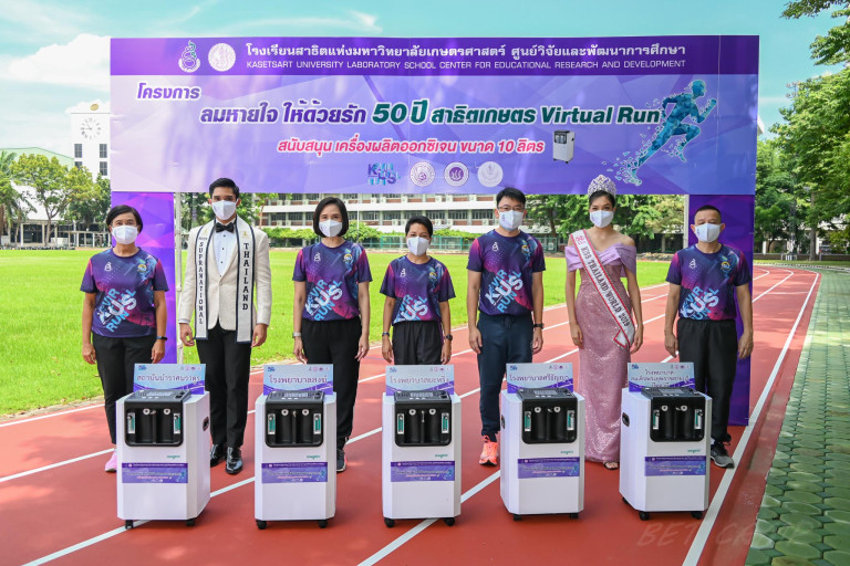 ในปี 2564 โรงเรียนสาธิตแห่งมหาวิทยาลัยเกษตรศาสตร์ ศูนย์วิจัยและพัฒนาการศึกษา ครบรอบ 50 ปี ได้จัด กิจกรรม 50 ปีสาธิตเกษตร Virtual Run การวิ่งในรูปแบบเสมือนจริงทางออนไลน์ขึ้นเป็นครั้งแรก ซึ่งตลอดระยะเวลา 50 ปีที่ผ่านมา เป็นวันเวลาของความรัก ความผูกพัน ความมุ่งมั่นพัฒนา กล้าคิด กล้าทำ เป็นผู้นำการเปลี่ยนแปลงที่พร้อมนำพานักเรียนสาธิตเกษตรทุกคนสู่ความสำเร็จเต็มตามศักยภาพแห่งตน และพร้อมสร้างสิ่งดีให้แก่สังคมไทยตลอดไป อนึ่ง ในสถานการณ์การแพร่ระบาดของเชื้อไวรัสโควิด-19 (Covid-19) โรงเรียนสาธิต แห่งมหาวิทยาลัย เกษตรศาสตร์ ศูนย์วิจัยและพัฒนาการศึกษา นำโดย อ.ดร.ผกามาศ นันทจีวรวัฒน์ ผู้อำนวยการ ร่วมกับ คุณจิรชยา จิรวณิช นายกสมาคมผู้ปกครองและครูฯ คุณภาคภูมิ วิวัฒน์วงศ์วนา ประธานจัดงาน พ.อ.วีรินทร์ จิตร์บำรุง อุปนายกสมาคมนักเรียนเก่า คุณพันทิพา พวงสุวรรณ ประธานชมรมรักษ์โรงเรียน เป็นตัวแทนในการส่งมอบเครื่องผลิตออกซิเจนจำนวน 5 เครื่องให้กับโรงพยาบาล 5 แห่ง ได้แก่ รพ.สงฆ์ รพ.บำราศนราดูร รพ.ศรีธัญญา รพ.สมเด็จพระยุพราชสายบุรีปัตตานี และรพ.ยะหริ่งปัตตานี โดยเชิญ 2 ศิลปิน ได้แก่ นางสาวนรินทร ชฎาภัทรวรโชติ Miss Thailand World 2019-2021 ได้รับการแต่งตั้งเป็นทูตกรมสุขภาพจิต กระทรวงสาธารณสุข และนายนิปุณ แก้วเรือน Mister Supranational Thailand 2021 และนักเรียนเก่าสาธิตเกษตรรุ่น 45 ซึ่งการมอบเครื่องผลิตออกซิเจนนี้ เป็นส่วนหนึ่งของการจัดกิจกรรม 50 ปีสาธิตเกษตร Virtual Run ภายใต้โครงการ “ลมหายใจ ให้ด้วยรัก” โดยขอเรียนเชิญ นักเรียนเก่าสาธิตเกษตรทั่วประเทศ คณาจารย์ ผู้ปกครอง อีกทั้งประชาชนผู้สนใจสามารถลงทะเบียนเข้าร่วมกิจกรรมได้ ตั้งแต่วันนี้ถึง 31 ตุลาคมนี้ ผ่านทาง www.runlah.com หรือติดตามข้อมูลข่าวสารได้ที่ Facebook : KUS 50th Anniversary Virtual Run เราจะร่วมกันส่งต่อ “ลมหายใจ ให้ด้วยรัก” ให้กับผู้ป่วยโควิดด้วยกัน “ฟิตวันละนิด ก่อนกลับมาใกล้ชิดกัน”