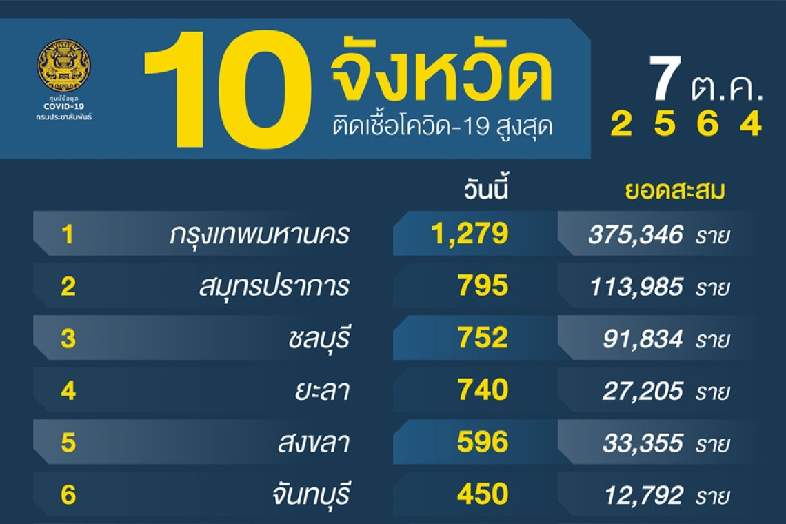 เมื่อวันที่ 7 ต.ค.64 ศูนย์ข้อมูลโควิด-19 รายงานสถานการณ์โรคติดเชื้อไวรัสโควิด-19 ในประเทศไทย ข้อมูล ณ วันที่ 7 ต.ค.64 เวลา 01.00 น. พบผู้ติดเชื้อรายใหม่ใน 75 จังหวัด มีเพียง 2 จังหวัดที่ไม่พบผู้ติดเชื้อรายใหม่คือ น่าน และแพร่ โดยกทม.ยังคงพบผู้ติดเชื้อสูงสุดโดยเพิ่มขึ้นจากเมื่อวานเล็กน้อยอยู่ที่ 1,279 ราย ตามด้วยสมุทรปราการอันดับสอง 795 ราย ชลบุรีอันดับสาม 752 ราย ยะลา มาอันดับสี่ โดยวันนี้ภาคใต้ขึ้นท็อปเท็น 4 จังหวัดคือ ยะลา สงขลา นราธิวาส และนครศรีธรรมราช รวมทั้งภาคตะวันออกมี 4 จังหวัดขึ้นท็อปเท็นเช่นกัน และพบมี 31 จังหวัดที่มีผู้ติดเชื้อรายใหม่เกินร้อย ภาคใต้ยังสูงสุด ขณะที่ภาคตะวันออกและภาคตะวันตกพบผู้ติดเชื้อรายใหม่เกินร้อยยกทั้งภาค