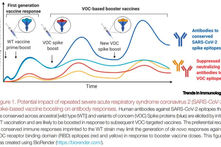 ประเด็นสำคัญคือ วัคซีนทุกชนิดที่ฉีดกันอยู่ตอนนี้ออกแบบมาจากสไปค์ของสายพันธุ์ Wuhan ดั้งเดิม ในภาพคือสไปค์ที่มีหัว RBD สีฟ้า การได้รับวัคซีนชนิดนี้เข้าไป ร่างกายจะสร้างแอนติบอดีต่อสไปค์ ซึ่งเส้นสีฟ้า คือ แอนติบอดีต่อ RBD และเส้นสีน้ำเงินคือแอนติบอดีต่อส่วนอื่นสไปค์ที่ไม่เกี่ยวกับการป้องกันการเข้าสู่เซลล์ของไวรัส จากภาพจะเห็นว่าเมื่อได้รับวัคซีนเข้าไป ระดับแอนติบอดีจะขึ้นและตกลงอีก การกระตุ้นก็จะสูงขึ้นอีกและตกลงได้อีกแต่ระดับที่ตกลงมักจะไม่ต่ำกว่าการตกลงครั้งแรก แต่สิ่งที่อยากให้สังเกตคือสีของเส้นกราฟ การได้วัคซีน Wuhan ซ้ำๆ จะเป็นการกระตุ้นให้กราฟสีน้ำเงิน และ สีฟ้า สูงขึ้นๆไปเรื่อยๆ