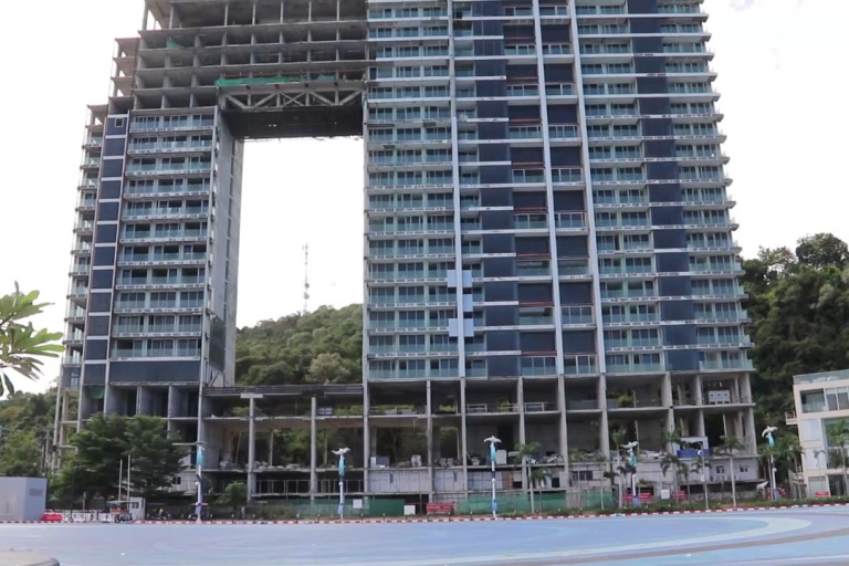 โดยทางโครงการระบุในสัญญาว่าจะทำการก่อสร้างให้แล้วเสร็จ พร้อมส่งมอบห้องพักให้ผู้ซื้อได้ภาย ในเดือน ธ.ค.2558 แต่สุดท้ายในช่วงปลายปี 2551 นายอิทธิพล คุณปลื้ม นายกเมืองพัทยาในสมัยนั้น ได้มีคำสั่งให้ระงับการก่อสร้างไว้ พร้อมระบุว่าเมืองพัทยาไม่สามารถออกใบอนุญาตก่อสร้างในรอบที่ 3 ได้เนื่อง จากตรวจพบว่ามีการก่อสร้างผิดแบบตั้งแต่ฐานราก ตำแหน่งช่องลิฟต์ และบันไดหนีไฟ พร้อมสั่งการให้เจ้า หน้าที่สำนักการช่างเข้าตรวจสอบสภาพและตัวอาคารเพื่อให้แก้ไขรายละเอียดแบบแปลนรวม 42 จุด ทำให้ในช่วงปลายปี 2559 เจ้าของโครงการฯ ต้องแจ้งต่อเมืองพัทยาว่าพร้อมปฏิบัติตามเงื่อนไขและข้อกำหนดตามกฎหมาย รวมทั้งการลดระดับความสูงของอาคารลง 8 ชั้น เพื่อลดผลกระทบต่อภาคประชาชนที่ต่อต้านอย่างหนักโดยระบุว่าบดบังภูมิทัศน์ และตั้งขวางแนวพระบรมนุสาวรีย์ กรมหลวงชุมพรเขตอุดมศักดิ์ บนเขา สทร.5 พัทยา