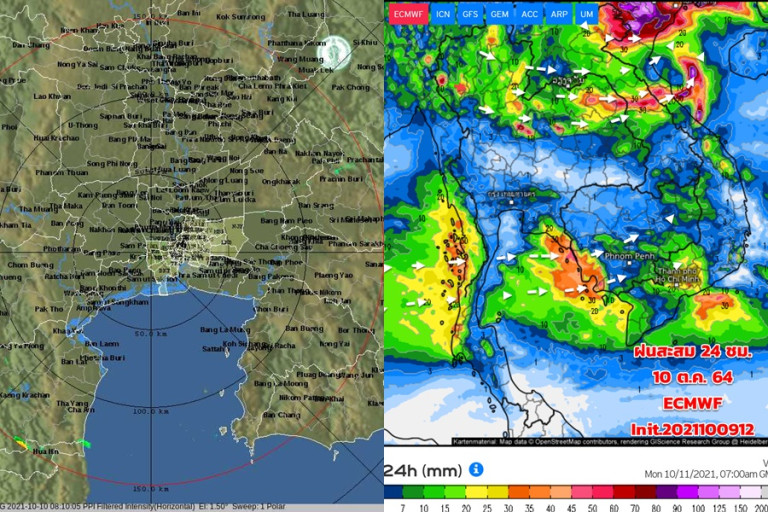 สำหรับร่องมรสุมที่พาดผ่านบ้านเราจะเริ่มแรงขึ้น ทำให้ฝนบริเวณภาคกลาง (รวม กทม.และปริมณฑล) ภาคอีสาน ภาคตะวันออก มีฝนเพิ่มขึ้น ส่วนภาคใต้ยังมีฝนตกต่อเนื่อง ส่วนมากทางตอนบนและตอนกลาง ฝนจะลดลง หลังวันที่18 ต.ค.64 (ข้อมูลนี้อาจจะมีการเปลี่ยนแปลงได้ ตามข้อมูลนำเข้าใหม่ ใช้เพื่อประกอบการตัดสินใจ)