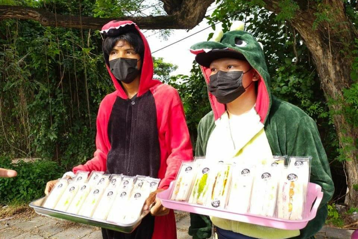 2 หนุ่มและน้องสาวแต่ง ชุดไดโนเสาร์ ชุดจระเข้ ชุดมังกร ที่คุณแม่ทำไว้ให้ขายเพื่อเลี้ยงชีพในครอบครัวโดยใช้ชื่อแซนวิช สู้โควิดชิ้นละ 20 บาท บริเวณแยกสัญญาณไฟองครักษ์