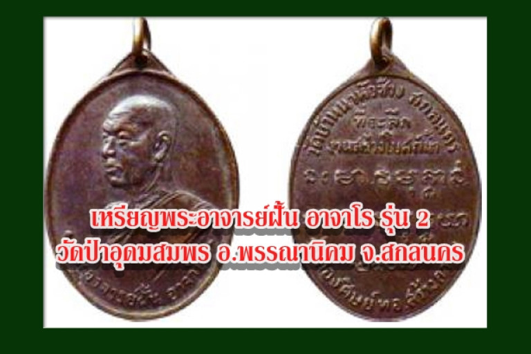 สำหรับ 'เหรียญพระอาจารย์ฝั้น อาจาโร' รุ่น 2 สร้างปี 2507 พิมพ์น้ำตัน (พิมพ์นิยม) จัดสร้างเพียง 216 เหรียญ โดยศิษย์คณะศิษย์ทหารอากาศ เป็นผู้จัดสร้างถวาย ลักษณะเป็นเหรียญรูปไข่ มีหูห่วง ด้านหน้าเหรียญ ตรงกลางเป็นรูปเหมือนหลวงปู่ฝั้นครึ่งองค์หันหน้าด้านข้าง ด้านโค้งขอบล่างใต้รูปเหมือน เขียนคำว่า "พระอาจารย์ฝั้น อาจาโร"