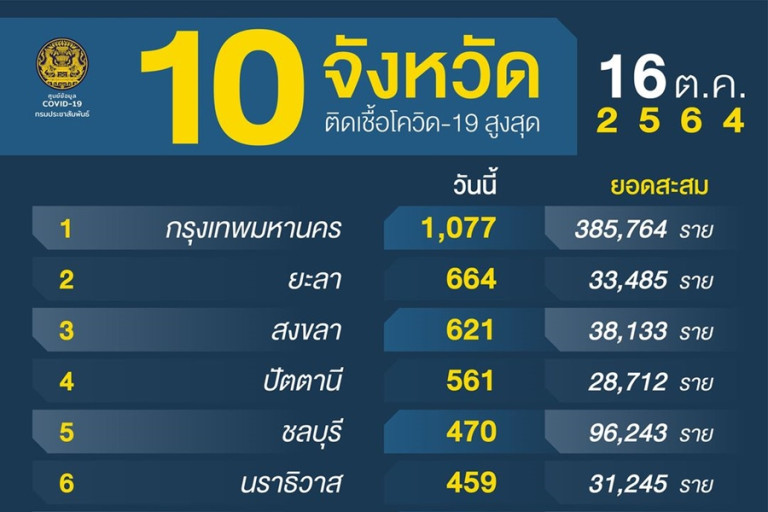 เมื่อวันที่ 16 ต.ค.64 ศูนย์ข้อมูลโควิด-19 รายงานสถานการณ์โรคติดเชื้อไวรัสโควิด-19 ข้อมูล ณ วันที่ 16 ต.ค.64 ประเทศไทยยังพบผู้ติดเชื้อรายใหม่ใน 74 จังหวัด โดยมี 3 จังหวัดที่ผู้ติดเชื้อรายใหม่เป็น 0 คือ สิงห์บุรี น่าน และนครพนม ขณะที่กทม.ยังคงพบผู้ติดเชื้อรายใหม่สูงสุดและยอดสะสมสูงสุด โดยยังคงมี 5 จังหวัดภาคใต้ที่ติดท็อปเท็น ซึ่งอันดับ 2 ยังอยู่ที่ ยะลา ตามด้วยอันดับ 3 สงขลา อันดับ 4 ปัตตานี อันดับ 6 นราธิวาส อันดับ 8 นครศรีธรรมราช โดยมีภาคตะวันออก ชลบุรี มาแทรกลำดับ 5 ภาคกลาง สมุทรปราการอันดับ 7 ภาคตะวันออก จันทบุรี และระยอง อันดับ 9 และ 10 โดยมี 31 จังหวัดที่พบผู้ติดเชื้อรายใหม่เกินร้อย
