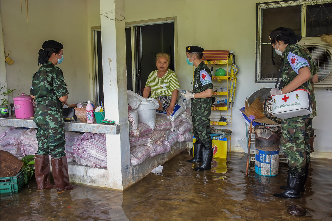 ซึ่งจากการลงพื้นที่ในครั้งนี้ พบว่า มีประชาชนเริ่มได้รับผลกระทบจากน้ำท่วมบ้างแล้ว ทั้งอาการปวดเมื่อยจากการยกของหนีน้ำ และบางรายเริ่มมีอาการน้ำกัดเท้าจากการแช่น้ำเป็นเวลานาน ซึ่งทีมแพทย์-พยาบาล และทหารเสนารักษ์ ได้ให้การตรวจรักษาขั้นต้น พร้อมทั้งได้เข้าเยี่ยมดูแลตรวจสุขภาพให้กับผู้ป่วยติดเตียง ผู้สูงอายุ เด็ก และประชาชนทั่วไป ที่อาศัยอยู่ในบ้านเรือนของพื้นที่ประสบภัยน้ำท่วมด้วย โดยได้มีการพูดคุยให้กำลังใจ ให้คำปรึกษา และการให้คำแนะนำในการดูแลสุขภาพกับผู้ป่วย และครอบครัว พร้อมจัดยาสามัญประจำบ้าน และเวชภัณฑ์ มอบให้กับประชาชนผู้ประสบภัยน้ำท่วม เพื่อไว้ใช้ดูแลรักษาสุขภาพป้องกันโรคที่มากับน้ำท่วมในครั้งนี้อีกด้วย