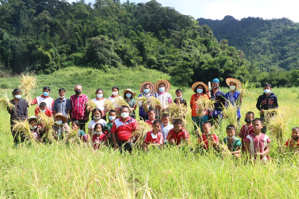 ครูธีรยุทธ วุฒิธรรมฐาน เล่าว่า ที่นี่ เราไม่มีสัญญาณโทรศัพท์ โรงเรียนของเราจึงเหมือนตัดขาดจากโลกภายนอก เราจึงไม่สามารถที่จะโทรสั่งอาหาร หรือวัตถุดิบได้เหมือนที่อื่น เราจึงต้องผลิตกันเอง และได้รับการสนับสนุนจากผู้ปกครอง ในการมาช่วยสอนเด็กๆปลูกข้าว สอนเกี่ยวข้าว ตีข้าว ก่อนนำไปสี ผลผลิตที่เกิดขึ้น ไม่เพียงเป็นอาหารกลางวันของเด็กๆเท่านั้น