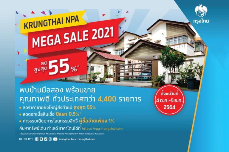 "กรุงไทย" จัดมหกรรมบ้านมือสอง ขนทรัพย์ NPA ชั้นดีจากทำเลต่างๆ ทั่วไทยกว่า 4,400 รายการลดราคายิ่งใหญ่ สูงสุด 55% มูลค่ากว่า 16,000 ล้านบาท พร้อมโปรโมชั่นดีๆ จะอยู่เองหรือเก็งกำไร ยังไงก็คุ้ม Krungthai NPA MEGA Sale 2564 ตั้งแต่วันที่ 4 ต.ค. – 5 ธ.ค. 2564