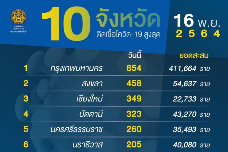 "เชียงใหม่" ยังแรงไม่ตกมาที่ 3 ขณะกทม.ขยับเพิ่มเข้าใกล้หลักพันอีก แม้ภาพรวมตัวเลขจะลดลงแต่ทั้งกทม. ใต้ และเชียงใหม่ ยังทรง เมื่อวันที่ 16 พ.ย.64 ศูนย์ข้อมูลโควิด-19 รายงานสถานการณ์ผู้ติดเชื้อไวรัสโควิด-19 ข้อมูล ณ วันที่ 16 พ.ย.64 เวลา 01.00 น. ประเทศไทยยังคงพบผู้ติดเชื้อรายใหม่ในทั้ง 77 จังหวัด โดยมากที่สุดที่กทม.ที่ขยับเพิ่มขึ้นจากเมื่อวานอยู่ที่ 854 ราย ขณะที่จังหวัดที่พบผู้ป่วยรายใหม่น้อยที่สุดมี 2 จังหวัดคือ อุทัยธานี และอ่างทอง จังหวัดละ 1 ราย ขณะที่ภาคใต้ยังคงติดท็อปเท็นถึง 6 จังหวัด ไล่ตั้งแต่อันดับที่ 2 สงขลา คั่นด้วยเชียงใหม่ อันดับ 3 ขณะอันดับ 4-7 มาจากใต้หมดทั้ง ปัตตานี อันดับ 4 นครศรีธรรมราช อันดับ 5 นราธิวาส อันดับ 6 สุราษฎร์ธานี อันดับ 7 และตรัง อันดับ 10 โดยมีสมุทรปราการ อยู่ในอันดับ 8 และชลบุรี อันดับ 9 ทั้งนี้ พบมี 14 จังหวัดที่พบผู้ป่วยติดเชื้อรายใหม่เกินร้อย ภาคใต้ ยังคงพบผู้ติดเชื้อรายใหม่เกินร้อยมากที่สุด 7 จังหวัดคือ สงขลา ปัตตานี นครศรีธรรมราช นราธิวาส สุราษฎร์ธานี ยะลา และตรัง ภาคกลาง พบผู้ติดเชื้อรายใหม่เกินร้อยใน 2 จังหวัดคือ กทม. และสมุทรปราการ ภาคตะวันออก พบผู้ติดเชื้อรายใหม่เกินร้อยใน 2 จังหวัดคือ ชลบุรี และระยอง ภาคเหนือ พบผู้ติดเชื้อรายใหม่เกินร้อย 1 จังหวัดคือ เชียงใหม่ ภาคตะวันออกเฉียงเหนือ พบผู้ติดเชื้อรายใหม่เกินร้อย 1 จังหวัดคือ นครราชสีมา ภาคตะวันตก พบผู้ติดเชื้อรายใหม่เกินร้อย 1 จังหวัดคือ ราชบุรี