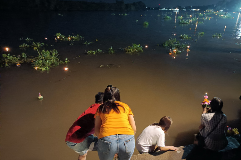 สวยเกินคำบรรยาย เงาสะท้อนผิวน้ำบางปะกงสว่างเรืองรองเป็นสีเงินในคืนวันลอยกระทง สวยเกินคำบรรยาย เงาสะท้อนผิวน้ำบางปะกงสุกสว่างเรืองรองเป็นสีเงินในค่ำคืนวันลอยกระทง ท่ามกลางผู้คนจำนวนมาก ที่ต่างพากันออกมาเดินท่องเที่ยวและลอยกระทงลงในสายน้ำ ทั้งที่ทางเทศบาลเมืองฉะเชิงเทรา ไม่ได้มีการจัดงานวันลอยกระทง เหคุจากหวั่นเกรงกลายเป็นคลัสเตอร์ใหญ่ แพร่เชื้อโควิด 19 แต่ได้จัดให้มีการออกร้านค้ากระทงและอาหาร เพื่อช่วยกระตุ้นเศรษฐกิจภายในบริเวณสวนมรุพงศ์แทน วันที่ 20 พ.ย.64 เวลาส 00.30 น. ผู้สื่อข่าวรายงานบรรยากาศในค่ำคืนของวันลอยกระทง ที่บริเวณสวนมรุพงษ์ริมฝั่งลำน้ำบางปะกง ภายในเขตเทศบาลเมืองฉะเชิงเทรา ตั้งแต่ช่วงระหว่างหัวค่ำของวันที่ 19 พ.ย.64 จนถึงเวลาเที่ยงคืนของวันเพ็ญเดือนสิบสอง 20 พ.ย.64 ว่า ในปีนี้ทางเทศบาลเมืองฉะเชิงเทรา ไม่ได้มีการจัดงานวันลอยกระทงเหมือนอย่างเช่นในทุกๆ ปีที่ผ่านมา หลังจากเกิดการระบาดของโรคโควิด 19 ในพื้นที่ จ.ฉะเชิงเทรา อย่างรุนแรงตลอดช่วงหลายเดือนที่ผ่านมา แต่กลับมีประชาชนต่างพากันเดินทางเข้ามาลอยกระทง ภายในบริเวณสวนมรุพงษ์อย่างเนืองแน่น โดยเฉพาะในช่วงระหว่างเวลา 20.30 น. ไปจนถึงเวลา 23.00 น. นั้น ถือเป็นช่วงที่มีผู้คนเข้ามาลอยกระทงอย่างหนาแน่นมากที่สุด ขณะที่ทางฝ่ายประชาสัมพันธ์ของทางเทศบาลเมืองฉะเชิงเทรา ได้มีการประกาศชี้แจงถึงการไม่ได้จัดงานลอยกระทงในปีนี้อยู่เป็นระยะ โดยให้เหตุผลว่า เนื่องจากยังคงมีการระบาดของโรคโควิด 19 อยู่ในพื้นที่ ทางเทศบาลเมืองฉะเชิงเทรา จึงได้งดการจัดงานลอยกระทงในปีนี้ เพราะหวั่นเกรงว่าจะกลายเป็นคลัสเตอร์วันลอยกระทง แต่ได้มีการจัดให้ประชาชนในพื้นที่เข้ามาจองบูทออกร้านเพื่อค้าอาหารและกระทง ภายในบริเวณสวนมรุพงษ์แทน เพื่อเป็นการกระตุ้นเศรษฐกิจให้ประชาชนในพื้นที่มีรายได้ โดยมีการประกาศชี้แจงต่อประชาชนที่พากันเดินทางเข้ามาลอยกระทงอยู่เป็นระยะ ต่อเนื่องหลายครั้ง ขณะเดียวกันผู้สื่อข่าวรายงานว่า แม้ทางเทศบาลเมืองฉะเชิงเทรา จะไม่ได้มีการจัดงานลอยกระทงขึ้น แต่ก็ยังคงมีการระเล่นของชุมชนภายในบริเวณสวนมรุพงษ์ เช่น การละเล่นรำวง ที่บริเวณลานโลมา และการประดับไฟแสงสีตามกิ่งไม้จนสว่างเรืองรองไปทั่วทั้งบริเวณ ขณะที่บนสะพานเฉลิมพระเกียรติ 7 รอบ พระชนมพรรษา ได้มีการประดับไฟราวส่องสว่างตามแนวขอบสะพานเพียงเล็กน้อย แต่ที่พื้นท้องน้ำในบริเวณใต้สะพานและโดยรอบ กลับมีแสงสะท้อนลงมาจากดวงจันทร์วันเพ็ญ ซึ่งมีเมฆหลัวบดบังแสงให้เจือจางลงบ