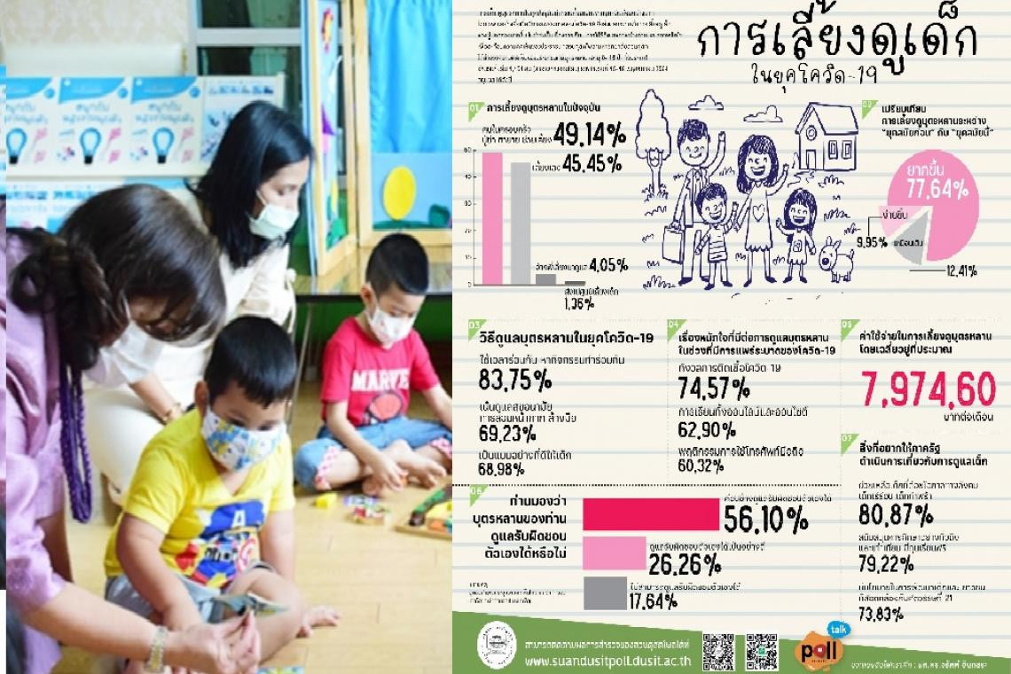 เมื่อวันที่ 21 พ.ย.64 สวนดุสิตโพล จากมหาวิทยาลัยสวนดุสิตได้สำรวจความคิดเห็นของประชาชนที่มีบุตรหลานอายุ 0-15 ปีทั่วประเทศ โดยถามถึงเรื่องหนักใจที่มีต่อการดูแลบุตรหลานในช่วงที่มีการแพร่ระบาดของโควิด-19อันดับ 1 กังวลการติดเชื้อโควิด-19 74.57% อันดับ 2 การเรียนทั้งออนไลน์และออนไซต์ 62.90% อันดับ 3 พฤติกรรมการใช้โทรศัพท์มือถือ 60.32% อันดับ 4 สภาพจิตใจ อารมณ์ 57.00% อันดับ 5 การฉีดวัคซีนโควิด-19 ให้กับเด็ก 52.83%
