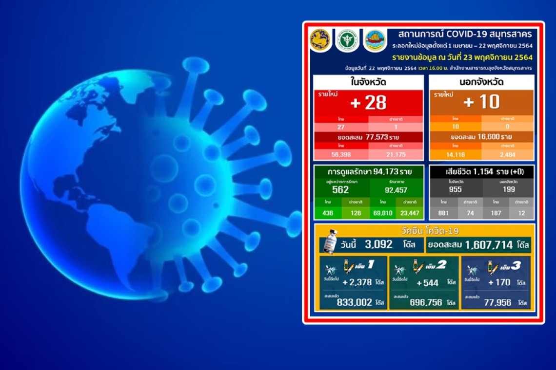 สำนักงานประชาสัมพันธ์จังหวัดสมุทรสาคร รายงานสถานการณ์ #civid-19 สมุทรสาคร (22 พ.ย.64) มีผู้ติดเชื้อรายใหม่ 38 รายอยู่ในจังหวัด 28 รายและนอกจังหวัด 10 ราย ไม่มีมีผู้เสียชีวิต อยู่ระหว่างการรักษาตัวในโรงพยาบาล 392 ราย รักษาหาย 31 ราย และอยู่ระหว่างการสังเกตอาการอีก 170 ราย
