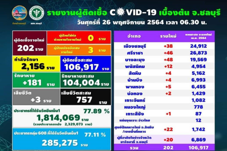 วันนี้ 26 พ.ย.64 สสจ.ชลบุรี มีรายงานผู้ติดเชื้อโควิด-19 รายใหม่ จำนวน 202 ราย จาก