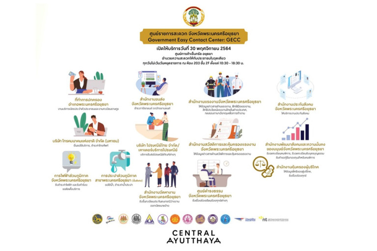 วันที่ 26 พฤศจิกายน 2564 ผู้สื่อข่าวได้รับรายงานว่า ด้วยจังหวัดพระนครศรีอยุธยา จะเปิดให้บริการศูนย์ราชการสะดวก ( Government Easy Contact Center : GECC ) จังหวัดพระนครศรีอยุธยา เริ่มตั้งแต่วันที่ 30 พฤศจิกายน 2564 เป็นต้นไป ทุกวัน เวลา 10.30 - 18.30 น. ณ ศูนย์การค้าเซ็นทรัลอยุธยา อำเภอพระนครศรีอยุธยา จังหวัดพระนครศรีอยุธยา เพื่อบูรณาการการอำนวยความสะดวกแก่ประชาชนในการติดต่อราชการ และขยายผลการให้บริการของหน่วยงานภาครัฐและรัฐวิสาหกิจ โดยเปิดให้บริการ ดังนี้ -งานบริการบัตรประจำตัวประชาชนและงานทะเบียนราษฎร -ชำระภาษีรถยนต์ รถจักรยานยนต์ -ชำระค่าโทรศัพท์ (NT) และยื่นคำขอใช้บริการ -ชำระค่าไฟฟ้า และรับคำร้องขอติดตั้ง -ชำระค่าน้ำประปา ยื่นขอใช้บริการน้ำ -บริการรับส่งไปรษณีย์ภัณฑ์ต่างๆ -รับขึ้นทะเบียนประกันตน กรณีว่างงาน และ ออกบัตรนายจ้าง -ให้ข้อมูลข่าวสารด้านแรงงาน, ฝึกฝีมือแรงงาน, สิทธิประโยน์แรงงานไทยในต่างประเทศ และทดสอบภาษาอังกฤษเพื่อการทำงาน -ให้ข้อมูลข่าวสารด้านสวัสดิการและคุ้มครองแรงงาน -รับเรื่องร้องเรียนร้องทุกข์ต่างๆ (ศูนย์ดำรงธรรม)
