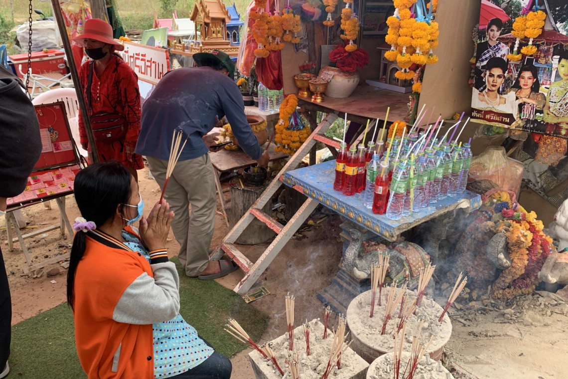 นางสาวบุญน้อม เหมือนมาก คนขายดอกไม้และน้ำกล่าวว่าตนเป็นคนจังหวัดสกลนคร ย้ายมาอยู่ศรีสะเกษนานแล้ว และถูกรถชนที่นี่ ก็เลยตั้งหลักและขอฮันนี่ให้ช่วยเหลือและถือเป็นบุญวาสนาที่ได้อยู่ที่นี่ โดยขอขายน้ำขายดอกไม้ให้คนที่มาขอโชคขอลาภจากเจ้าแม่ฮันนี่ แม้มีคนขายหลายราย ก็ยังทำให้ตนมีรายได้เลี้ยงชีพเหลือเดือนละหมื่นกว่าบาท วันนี้มีคนมาขอเลขเยอะเพราะพรุ่งนี้หวยออก มาจากนครปฐม บุรีรัมย์ โคราช สุรินทร์ ฯลฯ งวดที่ผ่านมาฮันนี่ก็ให้โชคคนถูกเลขได้เงินไป 5 แสน เขาก็นำของมาไหว้ถาดใหญ่ๆ
