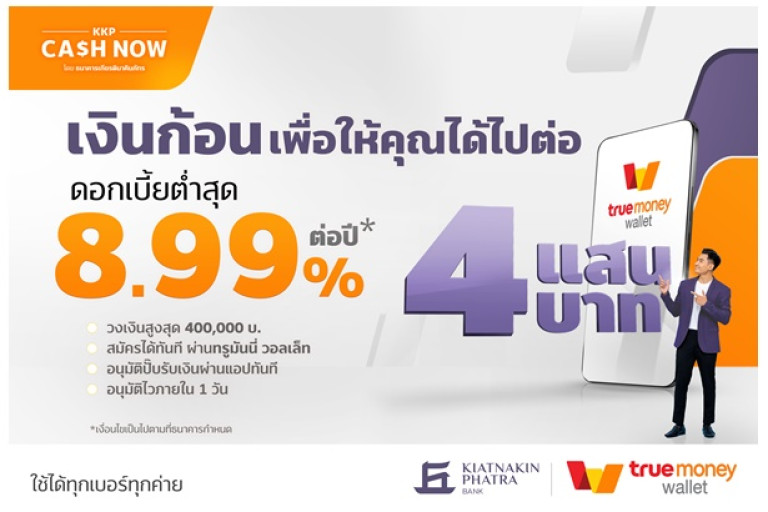 ธนาคารเกียรตินาคินภัทร จำกัด (มหาชน) ต่อยอดความร่วมมือกับทรูมันนี่ ผู้นำด้านบริการอิเล็กทรอนิกส์เพย์เมนท์ชั้นนำในภูมิภาคเอเชียตะวันออกเฉียงใต้ มอบบริการสินเชื่อส่วนบุคคลอเนกประสงค์ “KKP CASH NOW” บนแอปพลิเคชั่น TrueMoney Wallet เพื่ออำนวยความสะดวกในการสมัครและยื่นเอกสารขอสินเชื่อผ่านระบบออนไลน์ให้กับผู้ที่มองหาแหล่งเงินทุนหรือเพิ่มสภาพคล่อง ทั้งนี้ผู้สมัครสามารถรับวงเงินสินเชื่อเข้าบัญชีทรูมันนี่สูงสุดถึง 400,000 บาท ทันทีที่ได้รับอนุมัติ อัตราดอกเบี้ยเริ่มต้นเพียง 8.99%* ต่อปี ระยะเวลาผ่อนชำระนานสูงสุดถึง 60 เดือน มุ่งตอบสนองความต้องการสินเชื่อภาคครัวเรือนในไตรมาสสุดท้ายปีนี้ที่ ธปท.คาดว่ามีแนวโน้มเพิ่มขึ้นจากความเชื่อมั่นผู้บริโภคที่ปรับดีขึ้นหลังภาครัฐผ่อนคลายมาตรการ นายฟิลิป เชียง ชอง แทน กรรมการผู้จัดการใหญ่ ธนาคารเกียรตินาคินภัทร จำกัด (มหาชน) กล่าวว่า “การพัฒนานวัตกรรมทางการเงินเพื่ออำนวยความสะดวกสูงสุด และขยายโอกาสทางการเงินให้กับลูกค้าในวงกว้าง คือเป้าหมายร่วมกันของธนาคารเกียรตินาคินภัทร และทรูมันนี่ พันธมิตรคนสำคัญของเรา ธนาคารมั่นใจว่าบริการสินเชื่อ KKP CASH NOW บนแอปฯ TrueMoney Wallet จะช่วยเปิดโอกาสทางการเงินให้กว้างขวางและรวดเร็วยิ่งขึ้นสำหรับลูกค้า ผ่านการสมัคร ยื่นเอกสาร และทราบผลอนุมัติที่สะดวก ไม่เสียเวลาเดินทาง และลดความเสี่ยงจากการสัมผัสเงินสด ยิ่งในช่วงเวลานี้ที่เศรษฐกิจกำลังกลับมาเดินหน้า และหลายคนมองเห็นโอกาสสร้างรายได้เพิ่มหรือปรับธุรกิจรับความเปลี่ยนแปลง ธนาคารมั่นใจว่าสินเชื่อ KKP CASH NOW จะช่วยเพิ่มสภาพคล่อง ปลดล็อคข้อจำกัด หรือหมุนเวียนเป็นค่าใช้จ่ายต่างๆ ให้กับลูกค้าได้เป็นอย่างดี โดยธนาคารจะเดินหน้าผนึกกำลังกับพาร์ตเนอร์ที่มีความเชี่ยวชาญและจุดแข็งเฉพาะตัวอย่างเช่น บริษัท แอสเซนด์ มันนี่ จำกัด (TrueMoney) เพื่อนำเสนอนวัตกรรมที่ตอบโจทย์ลูกค้าในมิติต่างๆ อย่างต่อเนื่อง นายธัญญพงศ์ ธรรมาวรานุคุปต์ กรรมการผู้จัดการใหญ่ (ร่วม) บริษัท แอสเซนด์ มันนี่ จำกัด กล่าวว่า การขยายความร่วมมือกับธนาคารเกียรตินาคินภัทร จำกัด (มหาชน) ในครั้งนี้ เป็นไปตามกลยุทธ์ของเราในการมุ่งเป็น Financial Platform of Opportunities ที่มอบโอกาสทางการเงินให้กับผู้คนจำนวนมากและยังเป็นการสนับสนุนการสร้างสัมคมไร้เงินสดให้เติบโตผ่านบริการทางการเงินที่เรามี โดยบริการสินเชื่อ KKP CASH NOW บนแอปฯ TrueMoney Wallet เป็นอีกหนึ่งนวัตกรรมทางการเงินที่เราได้จับมือกับธนาคารเกียรตินาคินภัทร มอบให้ลูกค้า นอกเหนือจากบริการเงินฝากดอกเบี้ยสูง KKP Start Saving ซึ่งต