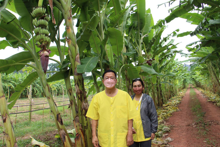ส่วนการปลูกกล้วยได้ความรู้จากน้องชายของภรรยา และอีกส่วนได้ไปศึกษาที่สถานีวิจัยปากช่อง จากมหาวิทยาลัยเกษตรศาสตร์ จ.นครราชสีมา โดยลูกกล้วยมีขนาดผลใหญ่ยาวพอดีกับที่เมืองนอก และห้างสรรพสินค้ามีความต้องการ รสชาติก็หวานไม่แพ้กันกับกล้วยน้ำว้าธรรมดา เวลาทำแพ็กกิ้งจะได้ขนาดไซต์ดี ดูสวยงาม บางเครือได้ 14 – 15 หวี ชั่งน้ำหนักหวีละประมาณ 2 กิโลกรัมครึ่ง บางหวีมีมากถึง 17 ลูก