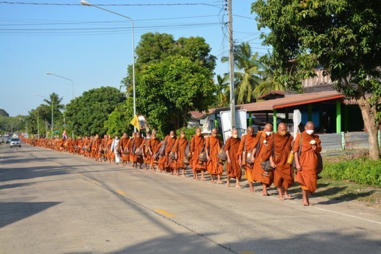 พระอาจารย์จรัณ อนังคโณ ประธานสงฆ์อุทยานธรรมดงยาง ต.คลีกลิ้ง อ.ศิลาลาด จ.ศรีสะเกษ กล่าวว่า พระสงฆ์ แม่ชี และแม่ขาวที่เดินธุดงค์ในวันนี้เป็นโครงการจาริกธุดงค์จากอุทยานธรรมดงยางไปที่วัดไพรพัฒนาเพื่อกราบสรีระสังขารของหลวงปู่สรวง ซึ่งเริ่มต้นออกเดินธุดงค์ตั้งแต่วันที่ 22 พ.ย. 2564 สิ้นสุดในวันนี้คือวันที่ 5 ธ.ค. 2564 รวมระยะทางประมาณ 150 กม. เพื่อถวายเป็นพระราชกุศลแด่พระบาทสมเด็จพระเจ้าอยู่หัวรัชกาลที่ 9 วันนี้เป็นวันสุดท้ายก็เลยจะได้ร่วมเจริญพระพุทธมนต์และปฏิบัติธรรมเพื่อเฉลิมพระเกียรติซึ่งถือว่าเป็นส่วนหนึ่งที่ให้ทั้งพระคุณเจ้าและญาติโยมได้ร่วมปฏิบัติธรรมด้วยกัน