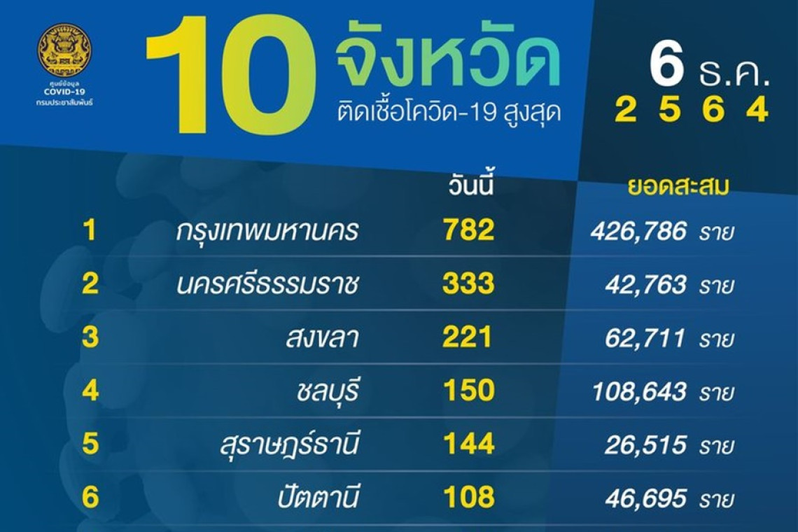 ศูนย์ข้อมูลโควิด-19 รายงานสถานการณ์โรคติดเชื้อไวรัสโควิด-19 ข้อมูล ณ วันที่ 6 ธ.ค.64 เวลา 01.00 น. ประเทศไทยยังพบผู้ติดเชื้อรายใหม่ใน 76 จังหวัด โดยจังหวัดที่ไม่พบผู้ติดเชื้อรายใหม่คือ อำนาจเจริญ 0 ราย ขณะที่กทม.ยังคงพบผู้ติดเชื้อรายใหม่มากที่สุดและมีผู้ติดเชื้อสะสมมากที่สุด ยอดรวมกว่า 4.2 แสนราย โดยผู้ติดเชื้อใหม่ยังสูงที่ 782 ราย ตามด้วยภาคใต้แม้ตัวเลขลดลงแต่ยังครองท็อปเท็น 5 อันดับ โดยอันดับ 2 นครศรีธรรมราช อันดับ 3 สงขลา อันดับ 5 สุราษฎร์ธานี อันดับ 6 ปัตตานี และอันดับ 10 พัทลุง ทั้งนี้ พบผู้ติดเชื้อรายใหม่เกินร้อยลดลงเหลือ 7 จังหวัด