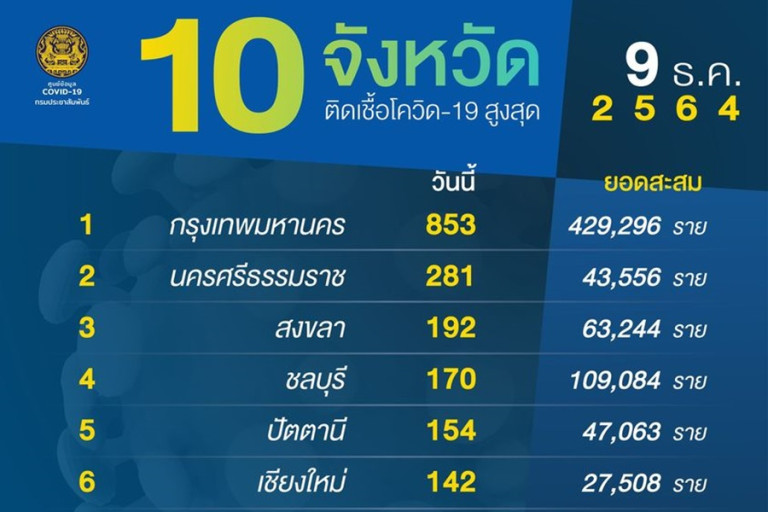 ศูนย์ข้อมูลโควิด-19 รายงานสถานการณ์โรคติดเชื้อไวรัสโควิด-19 ข้อมูล ณ วันที่ 9 ธ.ค.64 เวลา 01.00 น. ไทยยังคงพบผู้ติดเชื้อรายใหม่ใน 75 จังหวัด โดยมี 2 จังหวัดที่ไม่พบผู้ติดเชื้อรายใหม่คือ สุโขทัย และยโสธร 0 ราย กทม.ยังคงพบผู้ติดเชื้อรายใหม่มากที่สุด โดยเพิ่มขึ้นจากเมื่อวานที่ 853 ราย ขณะที่จังหวัดอื่นที่ขึ้นท็อปเท็น ตัวเลขก็ขยับเพิ่มขึ้นด้วยเช่นกัน โดยภาคใต้ที่ยังติดท็อปเท็น 4 จังหวัดคือ นครศรีธรรมราช อันดับ 2 สงขลา อันดับ 3 ปัตตานี อันดับ 5 และสุราษฎร์ธานี อันดับ 8 โดยมี 7 จังหวัดที่พบผู้ติดเชื้อรายใหม่เกินร้อย ภาคใต้ พบผู้ติดเชื้อรายใหม่เกินร้อย 3 จังหวัดคือ นครศรีธรรมราช สงขลา และป้ตตานี ภาคกลาง พบผู้ติดเชื้อรายใหม่เกินร้อย 2 จังหวัดคือ กทม. และสมุทรปราการ ภาคตะวันออก พบผู้ติดเชื้อรายใหม่เกินร้อย 1 จังหวัดคือ ชลบุรี ภาคเหนือ พบผู้ติดเชื้อรายใหม่เกินร้อย 1 จังหวัดคือ เชียงใหม่ ขณะที่ภาคตะวันออกเฉียงเหนือ-ภาคตะวันตก ไม่พบผู้ติดเชื้อรายใหม่เกินร้อย