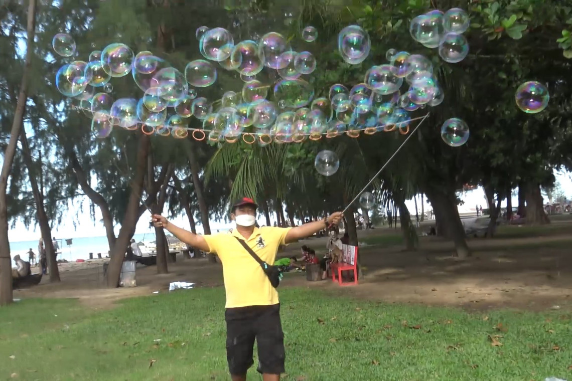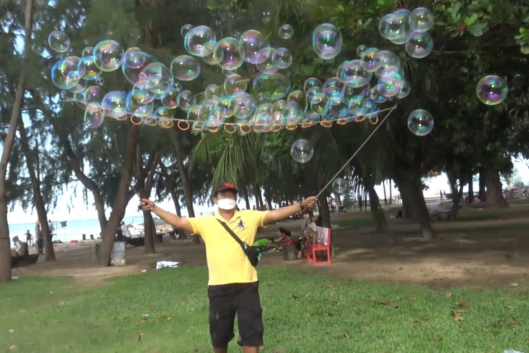 สีสัน..ชายหาดสมิหลาสงขลา ช่วงวันหยุดสุดสัปดาห์ ที่ท่านผู้ชมเห็นอยู่นี้ เป็นอาชีพที่สร้างรายได้อย่างงาม ให้กับนายชรินทร์ ช่วยคง อายุ 42 ปี หรือ อาเฟย Bubble ฟองสบู่ยักษ์ ในช่วงวันหยุดสุดสัปดาห์ วันเสาร์และวันอาทิตย์รวมทั้งวันนักขัตฤกษ์ต่างๆโดยอาเฟย จะโชว์ลีลาการเล่นฟองสบู่ยักษ์ ให้เด็กๆและนักท่องเที่ยวได้ดูเป็นตัวอย่าง ถึงความสวยงามของฟองสบู่ยักษ์ ที่คิดสูตรน้ำยาขึ้นมาเอง รวมทั้งประดิษฐ์อุปกรณ์ในการเล่น มีหลากหลายแบบให้เลือก ที่สร้างความสนุกสนานให้กับเด็กๆ วัยรุ่น ผู้ใหญ่ ผู้ปกครอง ก็สามารถเล่นได้อย่างสนุกสนาน