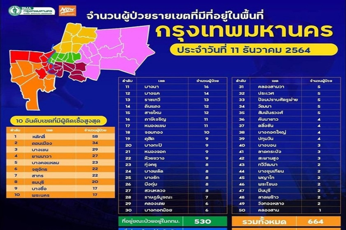 กรุงเทพมหานคร รายงานจำนวนผู้ป่วยรายเขตที่มีที่อยู่ในพื้นที่กรุงเทพฯ ประจำวันที่ 11 ธ.ค.64 รวม 50 เขต