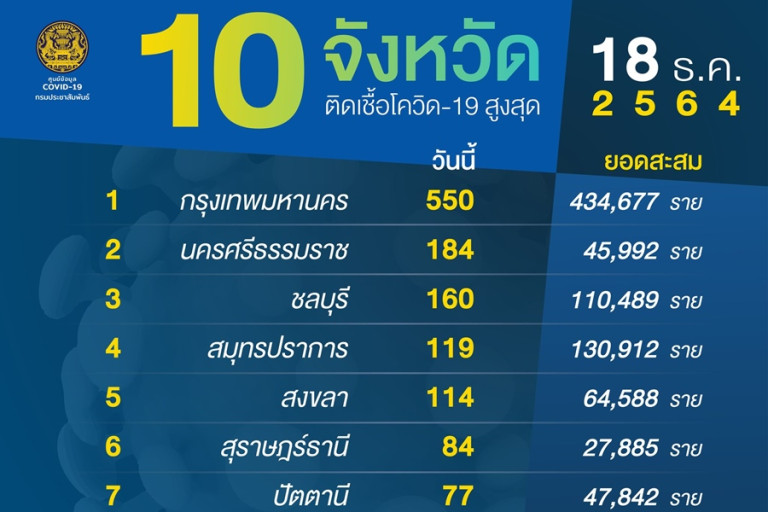 ศูนย์ข้อมูลโควิด-19 รายงานสถานการณ์โรคติดเชื้อไวรัสโควิด-19 ข้อมูล ณ วันที่ 18 ธ.ค.64 เวลา 01.00 น. ประเทศไทยพบผู้ติดเชื้อรายใหม่กระจายใน 74 จังหวัด โดยมี 3 จังหวัดที่ไม่พบผู้ติดเชื้อรายใหม่คือ อุทัยธานี มุกดาหาร และระนอง (ซึ่งเป็นครั้งแรกที่พบจังหวัดทางภาคใต้ รายใหม่เป็น 0) โดยวันนี้ตัวเลขในแต่ละจังหวัดจะลดลงจากเดิม กทม.ยังคงพบผู้ติดเชื้อรายใหม่มากที่สุดลดลงจากเมื่อวานนี้อยู่ที่ 550 ราย ขณะภาคใต้ตัวเลขลดลงเช่นกัน พบติดท็อปเท็น 6 จังหวัด ได้แก่ อันดับ 2 นครศรีธรรมราช อันดับ 5-9 เรียงตามลำดับ สงขลา สุราษฎร์ธานี ปัตตานี พัทลุง และตรัง ทั้งนี้ พบมี 5 จังหวัดที่ตัวเลขผู้ติดเชื้อรายใหม่ยังเกินร้อย