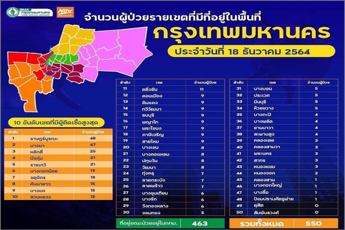 กรุงเทพมหานคร รายงานจำนวนผู้ป่วยรายเขตที่มีที่อยู่ในพื้นที่กรุงเทพฯ ประจำวันที่ 18 ธ.ค.64 รวม 50 เขต