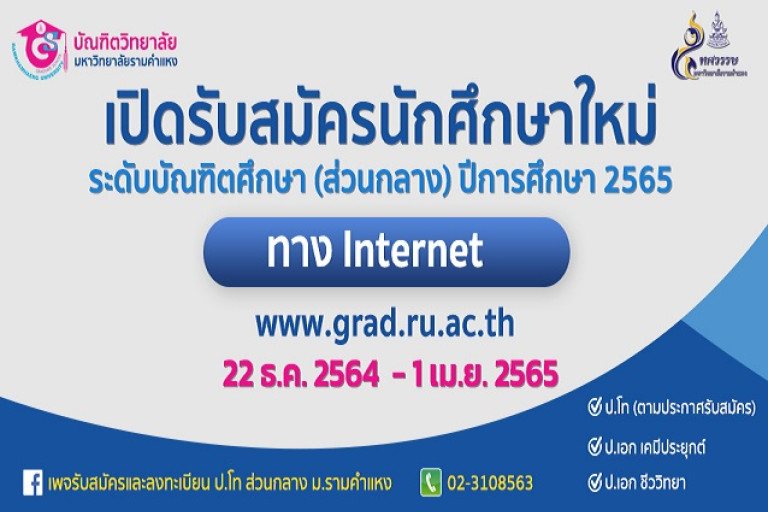 ผู้สนใจสามารถสมัครออนไลน์ได้ตั้งแต่บัดนี้ถึงวันที่ 1 เม.ย.65 สอบถามรายละเอียดเพิ่มเติมได้ที่ หน่วยรับสมัครและลงทะเบียน ฝ่ายบริการการศึกษา บัณฑิตวิทยาลัย อาคารท่าชัย ชั้น 1 โทร.0-2310-8563 หรือที่ www.grad.ru.ac.ht , Facebook : รับสมัครและลงทะเบียน ป.โท ส่วนกลาง ม.รามคำแหง