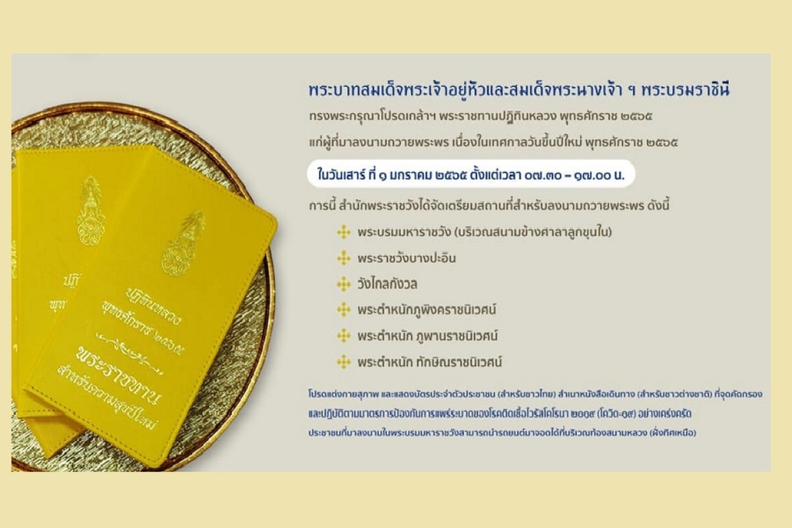 วันที่ 25 ธ.ค.2564 พระบาทสมเด็จพระเจ้าอยู่หัวและสมเด็จพระนางเจ้าฯ พระบรมราชินี ทรงพระกรุณาโปรดเกล้าฯพระราชทานปฏิทินหลวง พุทธศักราช 2565 แก่ผู้ที่มาลงนามถวายพระพร เนื่องในเทศกาลวันขึ้นปีใหม่ พุทธศักราช 2565 ในวันเสาร์ ที่ 1 มกราคม 2565 ตั้งแต่เวลา 07.30-17.00 น.