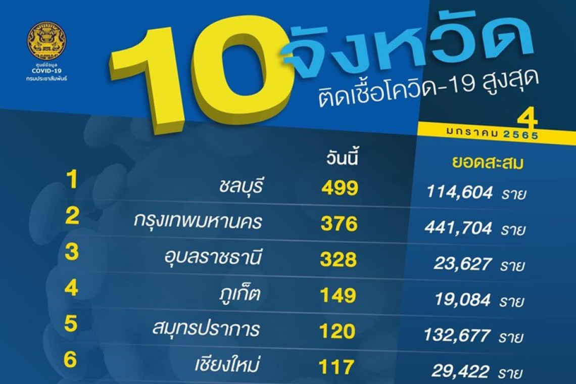 ศูนย์ข้อมูลโควิด-19 รายงานสถานการณ์โรคติดเชื้อไวรัสโควิด-19 ข้อมูล ณ วันที่ 4 ม.ค.65 เวลา 01.00 น. ประเทศไทย ยังพบผู้ติดเชื้อรายใหม่กระจายใน 75 จังหวัด โดยมีเพียง 2 จังหวัดที่ไม่พบผู้ติดเชื้อรายใหม่คือ อุทัยธานี ในภาคกลาง และภาคใต้ นราธิวาส โดยวันนี้ พบว่าชลบุรี มาแรงติดเชื้อรายใหม่เพิ่มแซงหน้ากทม.ขึ้นอันดับ 1 ประเทศ โดยทิ้งห่างกทม.หล่นอันดับ 2 ตามด้วย อันดับ 3 อุบลราชธานี อันดับ 4 ภูเก็ต อันดับ 5 สมุทรปราการ อันดับ 6 เชียงใหม่ ที่ทั้งหมดตัวเลขผู้ติดเชื้อรายใหม่ชยับเพิ่มขึ้นจากเมื่อวาน ทั้งนี้ พบมี 6 จังหวัดที่ตัวเลขผู้ติดเชื้อรายใหม่เกินร้อย ได้แก่