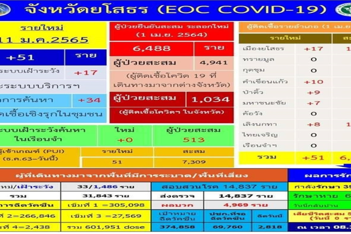 วันที่ 11 ม.ค.65 ผู้สื่อข่าวรายงานว่า จังหวัดยโสธรพบผู้ติดเชื้อไวรัสโควิด-19 เพิ่มอีก 51 ราย และผู้ติดเชื้อ เสียชีวิตสะสม 54 ราย โดยเริ่มตั้งแต่วันที่ 1 เมษายน 2564 ป่วยสะสมจำนวน 6,488 ราย รักษาหายสะสม 6,039 ราย กำลังรักษา 395 ราย โดยผู้ติดเชื้อไวรัสโควิด 19 ประกอบไปด้วยอำเภอเมืองยโสธร 1,375 ราย อำเภอทรายมูล 505 ราย อำเภอกุดชุม 778 รายอำเภอคำเขื่อนแก้ว 521 ราย อำเภอป่าติ้ว 370 ราย อำเภอมหาชนะชัย 746 ราย อำเภอค้อวัง 341 ราย อำเภอเลิงนกทา 1,000 ราย และอำเภอไทยเจริญ 339 ราย และ เรือนจำจังหวัดยโสธรจำนวน 513 ราย
