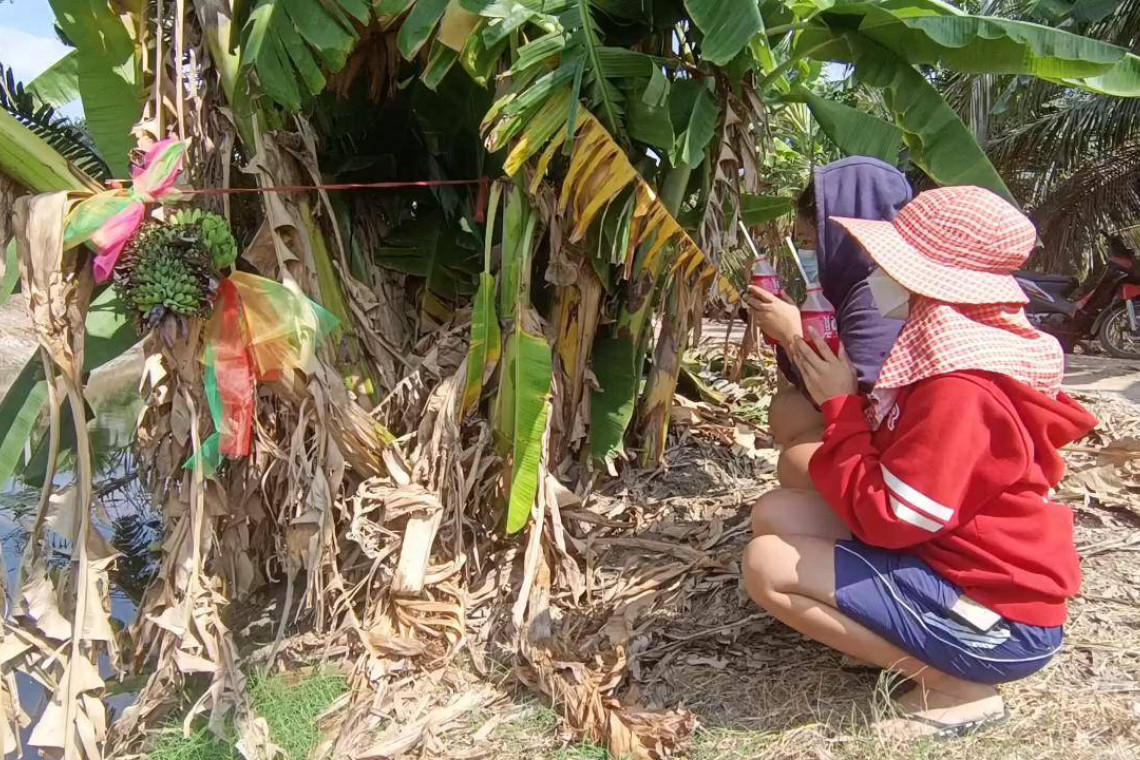 โดยที่สวนของนายสนองได้ปลูกต้นมะพร้าว และมีการปลูกต้นกล้วยน้ำว้า เพื่อทำเป็นแนวกันดินระหว่างสวนมะพร้าวกับคลองส่งน้ำสาธารณะ ซึ่งจะปลูกเป็นกอขนาดใหญ่ สลับกันไป ส่วนต้นกล้วยที่มีความแปลกออกเครือกลางลำต้นนั้น พบว่าเป็นต้นกล้วยที่ใกล้จะล้ม มีสภาพเอนเอียง ทางลุงสนองต้องนำเชือกมาผูกรั้งเอาไว้ มีความสูงประมาณ 2 เมตร ที่กลางลำต้นพบว่ามีเครือกล้วยงอกออกมาและมีกล้วยจำนวน 9 หวี นับได้ประมาณ 85 ลูก และยังมีหัวปีขนาดเล็ก 1 หัว ชี้ไปทางน้ำ ลักษณะเหมือนงูเลื้อย โดยมีเพื่อนบ้านมาขอดูต้นกล้วย พร้อมกับนำผ้าสามสี และน้ำแดง มาเซ่นไหว้ ขอเลขเด็ดตามความเชื่อ พร้อมกับส่องเลขเด็ดบนลูกกล้วย ที่ปรากฏตัวเลขอย่างเด่นชัด 56 / 59 / 58 ชาวบ้านที่มาหาเลขเด็ดต่างก็นำโทรศัพท์ถ่ายภาพเก็บไว้เพื่อนำไปเสี่ยงโชค เพราะเชื่อว่านางตานีให้โชคลาภในงวดนี้