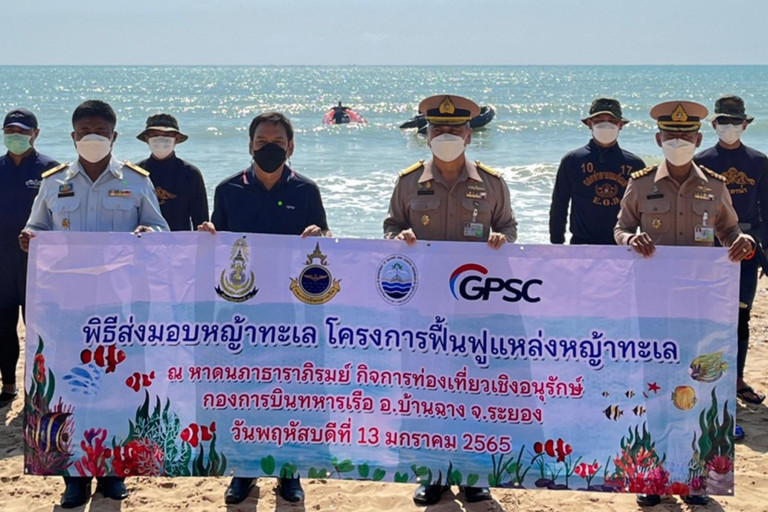 ณรงค์ชัย วิสูตรชัย ผู้จัดการฝ่ายอาวุโสรัฐกิจสัมพันธ์และกิจการสาธารณะ บริษัท โกลบอล เพาเวอร์ ซินเนอร์ยี่ จำกัด (มหาชน) หรือ GPSC แกนนำนวัตกรรมธุรกิจไฟฟ้ากลุ่ม ปตท.ในฐานะผู้แทนกลุ่มจีพีเอสซี ร่วมกับทัพเรือภาคที่ 1 และศูนย์วิจัยทรัพยากรทางทะเลและชายฝั่งอ่าวไทยฝั่งตะวันออก (ศวทอ.) จัดพิธีส่งมอบหญ้าทะเลใน “โครงการฟื้นฟูแหล่งหญ้าทะเล” ซึ่งขยายผลจากโครงการนำร่องปลูกหญ้าทะเล จำนวน 5,000 กอ ในพื้นที่ 3 ไร่ ในเดือนธันวาคม 2564 ที่ผ่านมา เพื่อฟื้นฟูระบบนิเวศและทรัพยากรธรรมชาติทางทะเลให้อุดมสมบูรณ์ยิ่งขึ้น โดยได้รับเกียรติจาก พล.ร.ต.สมประสงค์ วิศลดิลกพันธ์ ผู้ทรงคุณวุฒิกองทัพเรือ เป็นประธานในพิธี บริเวณชายฝั่งหาดนภาธาราภิรมย์ กิจการท่องเที่ยวเชิงอนุรักษ์ กองการบินทหารเรือ อ.สัตหีบ จ.ชลบุรี