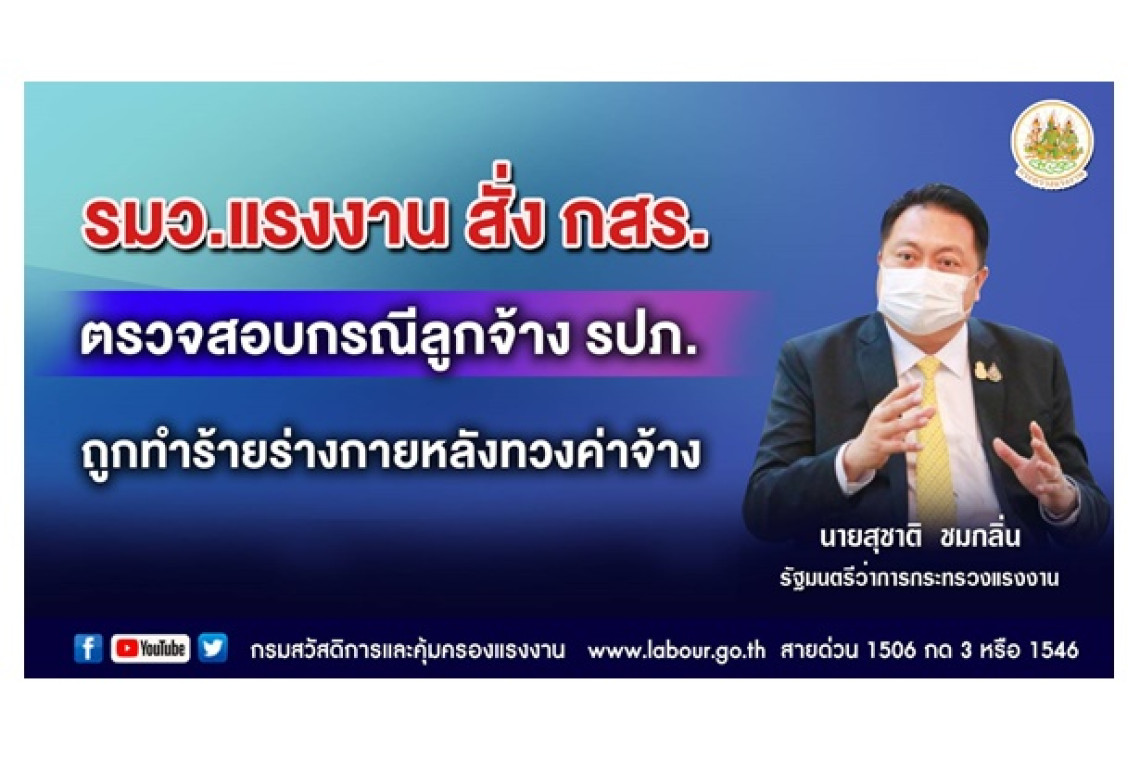รมว.แรงงานสั่งกรมสวัสดิการและคุ้มครองแรงงานตรวจสอบข้อเท็จจริงกรณีมีข่าวลูกจ้าง รปภ. ถูกนายจ้างทำร่ายร่างกาย หลังทวงค่าจ้างค้างจ่าย ได้รับบาดเจ็บเข้ารักษาตัวในโรงพยาบาล นายสุชาติ ชมกลิ่น รมว.แรงงาน กล่าวถึง กรณีสื่อสังคมออนไลน์นำเสนอข่าวลูกจ้างพนักงานรักษาความปลอดภัย (รปภ.) ถูกนายจ้างทุบตี ทำร้ายร่างกาย หลังเข้าทวงถามเงินค่าจ้างค้างจ่ายจากนายจ้างว่า ได้รับรายงานในเบื้องต้นว่า นายชินวัตร สมศรีงาม อายุ 26 ปี พนักงานรักษาความปลอดภัยของบริษัท รักษาความปลอดภัย ฟินิกซ์ ซิเคียวริตี้ เซอร์วิส จำกัด ตั้งอยู่ในพื้นที่อำเภอบางบัวทอง จังหวัดนนทบุรี ปฏิบัติงานในตำแหน่งหัวหน้าชุดรักษาความปลอดภัยที่หมู่บ้านพฤกษา 73 อำเภอเมืองสมุทรสาคร จังหวัดสมุทรสาคร ถูกนายจ้างทำร้ายร่างกายหลังจากไปพบนายจ้างเพื่อทวงถามเงินค่าจ้างค้างจ่าย เหตุเกิดเมื่อวันที่ 12 มกราคม 2565 ที่ผ่านมา โดยทั้ง 2 ฝ่าย ได้แจ้งความไว้ที่สถานีตำรวจนครบาลพระโขนง ซึ่งฝ่ายนายจ้างให้ปากคำว่าสาเหตุที่ไม่จ่ายค่าจ้างเพราะลูกจ้างได้ลงข้อความประจานทางเฟสบุ๊ค ในเพจของ รปภ. ทำให้ได้รับความเสียหาย โดยต้องการเคลียร์เรื่องลงประจานและลูกจ้างทิ้งงานไปให้จบก่อนแต่ลูกจ้างได้เข้ามาทำร้ายร่างกายจึงเกิดการต่อสู้กัน ซึ่งนายจ้างได้ใช้ท่อนเหล็กตีไปยังตัวลูกจ้างจนได้รับบาดเจ็บ ซึ่งเรื่องของการทำร้ายร่างกายเจ้าหน้าที่ตำรวจจะดำเนินการทางกฎหมายต่อไป ส่วนเรื่องคดีค้างจ่ายค่าจ้างได้มอบหมายให้กรมสวัสดิการและคุ้มครองแรงงานตรวจสอบข้อเท็จจริง และดำเนินการช่วยเหลือดูแลสิทธิประโยชน์ของลูกจ้างโดยเร็ว นายนิยม สองแก้ว อธิบดีกรมสวัสดิการและคุ้มครองแรงงานกล่าวว่า นายชินวัตร สมศรีงามได้ยื่นคำร้องผ่านระบบ E-service กรมสวัสดิการและคุ้มครองแรงงาน เมื่อวันที่ 14 มกราคม 2565 ขอรับค่าจ้างค้างจ่ายตั้งแต่วันที่ 26 ตุลาคมถึงวันที่ 6 ธันวาคม 2564 เป็นเงิน 20,500 บาท และค่าทำงานในวันหยุดประจำสัปดาห์ เป็นเงิน 1,986 บาท และเมื่อวันที่ 20 มกราคม 2565 นางสาวลักขณา กัญญานก ภรรยาของนายชินวัตรฯ ได้ใช้สิทธิยื่นคำร้องผ่านระบบ E-service กรมสวัสดิการและคุ้มครองแรงงาน เรียกค่าจ้างของการทำงานตั้งแต่วันที่ 26 ตุลาคม ถึงวันที่ 6 ธันวาคม 2564 จากนายจ้างรายเดียวกัน เป็นเงิน 17,750 บาท ค่าทำงานในวันหยุด เป็นเงิน 1,986 บาท ซึ่งพนักงานตรวจแรงงานได้มีหนังสือเชิญนายจ้างมาให้ข้อเท็จจริงแล้ว และจะดำเนินการสอบข้อเท็จจริงและเรียกร้องสิทธิประโยชน์ให้กับลูกจ้างโดยเร็ว