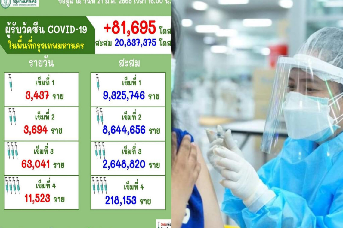 กรุงเทพมหานคร รายงานผลการให้บริการวัคซีน COVID-19 ในพื้นที่กรุงเทพมหานคร ข้อมูล ณ วันที่ 21 ม.ค.65 เวลา 16.00 น. ยอดผู้รับวัคซีนเพิ่ม 81,695 โดส ยอดผู้รับวัคซีนสะสม 20,837,375 โดส ผู้ได้รับวัคซีนเข็มที่ 1 จำนวน 9,325,746 ราย ผู้ได้รับวัคซีนเข็มที่ 2 จำนวน 8,644,656 ราย ผู้ได้รับวัคซีนเข็มที่ 3 จำนวน 2,68,820 ราย ผู้ได้รับวัคซีนเข็มที่ 4 จำนวน 218,153 ราย