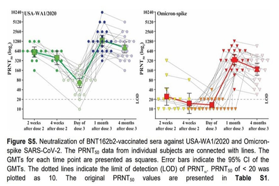 ทั้งนี้การที่ได้ภูมิระดับนี้ได้จำเป็นต้องมีข้อกำหนดสำคัญคือ ช่วงเวลาที่ได้รับเข็มกระตุ้นควรเป็นช่วงเวลาที่ร่างกายไม่มีภูมิที่สูง จากการศึกษานี้อาสาสมัครได้รับเข็มที่ 3 หลังจากได้เข็ม 2 มานานถึง 8-9 เดือน โดยภูมิก่อนได้รับเข็มกระตุ้นมีน้อยมากคือ 65 ต่อสายพันธุ์ดั้งเดิม และ 13 ต่อโอมิครอน ซึ่งเป็นช่วงเวลาที่เหมาะสมมากที่ร่างกายจะได้รับการกระตุ้นเข็ม 3 ซึ่งจะเห็นว่า หลังได้เข็มกระตุ้น ภูมิพุ่งสูงขึ้น เป็น 1342 (20.6 เท่า) ต่อสายพันธุ์ดั้งเดิม และ 336 (25.8 เท่า) ต่อสายพันธุ์โอมิครอน เชื่อว่าถ้าการกระตุ้นในช่วงที่ภูมิไม่ต่ำ ค่าแอนติบอดีที่กระตุ้นขึ้นมาได้อาจจะไม่สูงเท่า และ อยู่ไม่นานถึง 4 เดือนครับ
