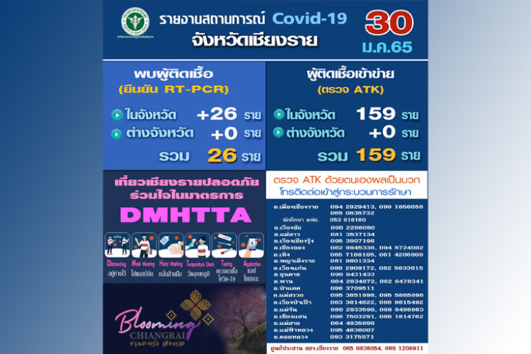 เชียงราย พบผู้ติดเชื้อรายใหม่ 26 ราย พบที่อำเภอแม่สายถึง 16 ราย ตรวจ ATK เป็นบวก 159 ราย เมื่อวันที่ 30 ม.ค. 2565 สำนักงานสาธารณสุขจังหวัดเชียงราย ได้รายงานสถานการณ์โรคโควิด 19 จังหวัดเชียงราย พบผู้ติดเชื้อตรวจยืนยัน RT-PCR R 26 ราย มาจากการสัมผัสผู้ป่วยใกล้ชิดผู้ป่วยก่อนหน้านี้ 8 ราย อยู่ในพื้นที่เสี่ยง ไม่มีประวัติสัมผัสผู้ป่วย 13 ราย สัมผัสในครอบครัว 5 ครอบครัว 5 ราย พบในพื้นที่ - อ.แม่สาย 16 ราย (ต.เวียงพางคำ 6 ราย, ต.โป่งงาม 4 ราย, ต.โป่งผา 2 ราย, ต.ศรีเมืองชุม 2 ราย, ต.แม่สาย 1 ราย, ต.บ้านด้าย 1 ราย) - อ.เมืองเชียงราย 6 ราย (ต.ดอยฮาง 2 ราย, ต.ริมกก 2 ราย, ต.รอบเวียง 1 ราย, ต.แม่ยาว 1 ราย) - อ.แม่ฟ้าหลวง 2 ราย (ต.เทอดไทย 2 ราย) - อ.แม่จัน 1 ราย (ต.แม่จัน 1 ราย) - รอรายงานการสอบสวน 1 ราย ติดเชื้อจากต่างจังหวัด/รับมารักษา +0 ราย ทั้งนี้ พบผู้ติดเชื้อเข้าข่าย ตรวจ ATK รวม 159 ราย (3 อันดับสูงสุด อ.เมือง 84 ราย อ.พาน 24 ราย อ.แม่ฟ้าหลวง 15 ราย) จำนวนผู้ติดเชื้อสะสม (ตั้งแต่ 1 ม.ค. 65) ผู้ติดเชื้อยืนยัน (RT-PCR) ในจังหวัด 819 ราย ต่างจังหวัด 78 ราย รวม 897 ราย ผู้ติดเชื้อเข้าข่าย (ตรวจ ATK) ในจังหวัด 4,536 ราย ต่างจังหวัด 20 ราย รวม 4,556 ราย ด้านการรักษา ผู้ติดเชื้อยืนยัน (RT-PCR) วันนี้ รักษาหายเพิ่ม 48 ราย กำลังรักษา 330 ราย รักษาหายสะสม 560 ราย ผู้ติดเชื้อเข้าข่าย (ตรวจ ATK) วันนี้ รักษาหายเพิ่ม 64 ราย กำลังรักษา 1,725 ราย รักษาหายสะสม 2,831 ราย เสียชีวิต ยอดสะสม (ตั้งแต่ 1 ม.ค.65) (RT-PCR) 7 ราย (ATK) 0 ราย