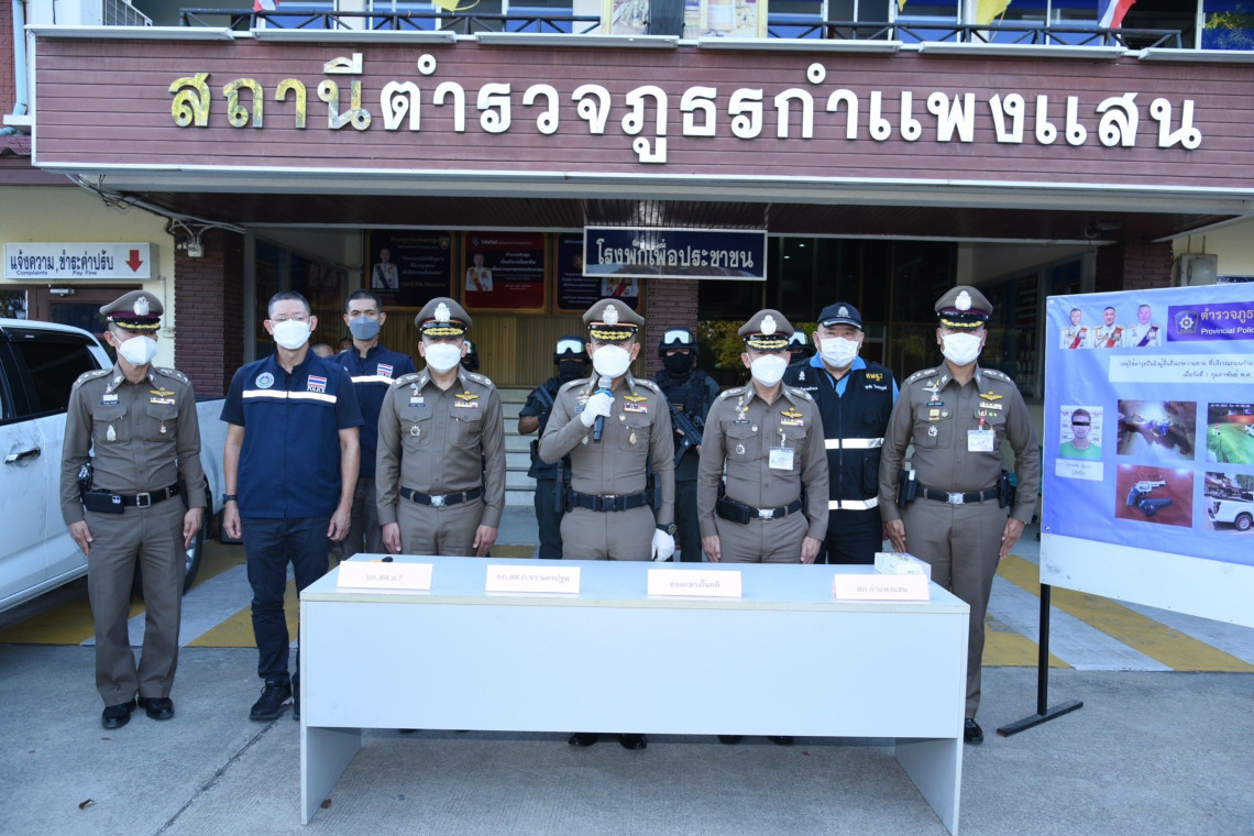วันที่ 3 ก.พ. 65 ที่สภ.กำแพงแสน ต.ทุ่งกระพังโหม อ.กำแพงแสน จ.นครปฐม พล.ต.ท.ธนายุตม์ วุฒิจรัสธำรงค์ ผบช.ภ.7 พร้อม พล.ต.ต.รักษ์จิต หม้อมงคล รอง ผบช.ภ.7(กม) พล.ล.ต.ชมชวิณ ปุระธนานนท์ ผบก.ภ.จว.นครปฐม พ.ต.อ.พงษกร อุปพงษ์ รอง ผบก.ภ.จว.นครปฐม พ.ต.อ.ชิตภพ โตเหมือน รอง ผบก.สส.ภ.7 พ.ต.อ.ศุภชัย ไตรสมบูรณ์ นวท.(สบ.5) ศพฐ.7 พ.ต.อ.ธีรเชษฐ์ ธนวินรวีร์ ผกก.สภ.กำแพงแสน และเจ้าหน้าที่ตำรวจที่เกี่ยวข้อง แถลงข่าวจับกุมนายมงคล หรือเอ๋ เชื้อพุก อายุ 43 ปี ตามหมายศาลจังหวัดนครปฐม ที่ จ.35/2565 ลงวันที่ 2 ก.พ. 2565,นายวินัย หรือยอด กองม่วง อายุ 29 ปี ตามหมายศาลจังหวัดนครปฐม ที่ จ.36/2565 ลงวันที่ 2 ก.พ.2565 และนายบุญนาค หรือโอ พรมประสิทธิ์ อายุ 37 ปี ตามหมายศาลจังหวัดนครปฐม ที่ จ.38/2565 ลงวันที่ 2 ก.พ.2565 ผู้ต้องหาตามหมายจับศาลจังหวัดนครปฐม ลงวันที่ 2 ก.พ. 2565 จำนวน 3 ราย ข้อหา "ร่วมกันฆ่าผู้อื่นโดยไตร่ตรองไว้ก่อน,ร่วมกันทำร้ายผู้อื่นไม่ถึงกับเป็นเหตุให้เกิดอันตรายแก่กายและจิตใจ,ร่วมกันมีอาวุธปืนและเครื่องกระสุนปืนไว้ในความครอบครองโดยไม่ได้รับอนุญาต,ร่วมกันยิงปืนซึ่งใช้ดินระเบิดโดยใช่เหตุ ในเมืองหมู่บ้านหรือที่ชุมชน และร่วมกันพาอาวุธปืนไปในเมือง หมู่บ้าน หรือทางสาธารณะโดยเปีดเผยหรือโดยไม่มีเหตุอันควรโดยไม่ได้รับอนุญาต" พร้อมยึดของกลาง รถยนต์กระบะยี่ห้อ อีซูชุ รุ่นดีแมก สี่ประตูสีขาว หมายเลขทะเบียน ขข 2127อุบลราชธานี, อาวุธปืนลูกโม่ ขนาด .38 จำนวน 1 กระบอก,ปลอกกระสุนปืน ขนาด .38 จำนวน 3 ปลอก เครื่องกระสุนปืนขนาด .38 จำนวน 1 นัด พล.ต.ท.ธนายุตม์ กล่าวถึงพฤติการณ์แห่งคดีว่า เมื่อวันที่ 1 ก.พ. 2565 เวลาประมาณ 01.50 น. เกิดเหตุคนร้ายใช้อาวุธปืนยิง นายพรชัย หรือเก่ง เมืองนก อายุ 28 ปี เสียชีวิตที่บริเวณริมถนน กำแพงแสน-พระแท่น (ถนนหมายเลข 346) ฝั่งขาเข้า อ.กำแพงแสน หมู่ 6 ต.รางพิกุล อ.กำแพงแสนจว.นครปฐม เจ้าหน้าที่ตำรวจ กก.สส.1 บก.สส.ภ.7 ,เจ้าหน้าที่ตำรวจ กก.สส.ภ.จว.นครปฐม และเจ้าหน้าที่ตำรวจ สภ.กำแพงแสน ได้ร่วมกันสืบสวนจนทราบว่า ผู้ร่วมก่อเหตุใช้อาวุธปืนยิงผู้เสียชีวิตในครั้งนี้ มีจำนวน 4 ราย คือ 1 นายวินัยหรือยอด กองม่วง 2 นายมงคล หรือเอ๋ เชื้อพุก 3 นายบุญนาค หรือโอ พรมประสิทธิ์ 4 นายจักรกฤษณ์ หรือเบ๊นซ์ อ่อนสัมพันธ์ โดยใช้รถยนต์กระบะยี่ห้อ อีซูซุ สี่ประตูสีขาว หมายเลขทะเบียน ขข 2127 อุบลราชธานี เป็นยานพาหนะและหลังก่อเหตุได้หลบหนีไป เจ้าหน้าที่ตำรวจจึงได้รวบรวมพยานหลักฐานเพื่อขออนุมัติหมายจับผู้ร่วมกระทำความผิดต่อศาลจังหวัดนครปฐม ซึ่งต่อมาศาลจังหวัดนครปฐมอนุมัติหมายจับผู้ร่วมก่อเหตุทั้ง 4 ราย และเจ้าหน้าที่ตำรวจสามารถติดตามจับกุมผู้