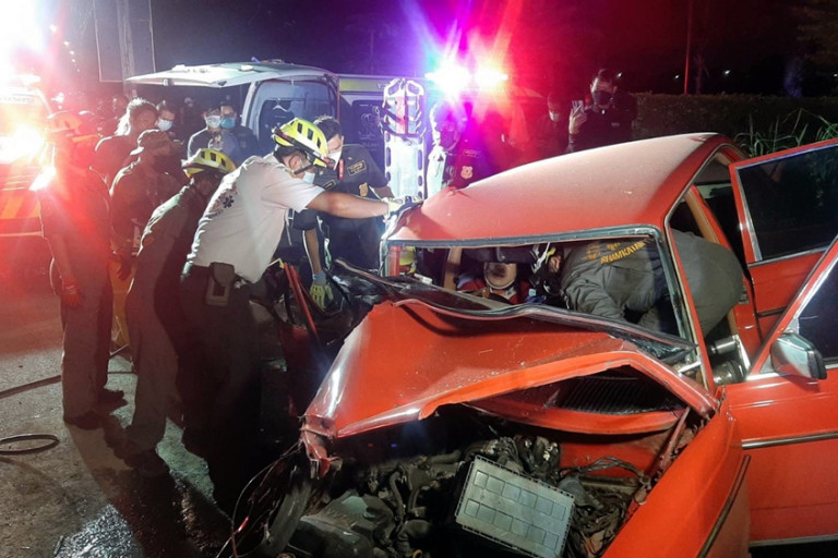 ที่เกิดเหตุพบเจ้าหน้าที่มูลนิธิกำลังใช้เครื่องตัดถ่างตัดโครงเหล็กซากรถยนต์เก๋ง ยีห้อ เบนซ์ สีแดง ทะเบียนกรุงเทพมหานคร เพื่อช่วยเหลือผู้บาดเจ็บเป็นชายชื่อนายอรรถ สิโรฐม์ อายุ 42 ปี คนขับเบนซ์คันดังกล่าว ใช้เวลากว่า 10 นาที จึงสามารถนำร่างผู้บาดเจ็บออกมาได้ เบื้องต้นได้ทำการปฐมพยาบาลก่อนนำส่งโรงพยาบาลใกล้เคียง ห่างไปประมาณ 100 เมตร พบรถบรรทุก 4 ล้อ ยี่ห้อ โตโยต้า สีน้ำเงิน ทะเบียนกรุงเทพมหานคร สภาพด้านหน้าพังยับเยิน ซึ่งมีนายจตุพร อายุ 34 ปี ชาวจังหวัดสุรินทร์ เป็นคนขับได้รับบาดเจ็บพร้อมคนงานก่อสร้างอีก 4 รายได้ถูกนำส่งโรงพยาบาลไปก่อนหน้าแล้ว