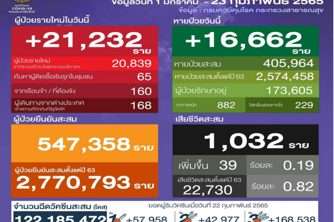วันที่ 23 ก.พ.2565 ที่ศูนย์บริหารสถานการณ์ โควิด-19 (ศบค.) นพ.ทวีศิลป์ วิษณุโยธิน โฆษกศูนย์บริหารสถานการณ์การแพร่ระบาดของโรคติดเชื้อไวรัสโคโรนา 2019 (ศบค.) รายงานสถานการณ์ผู้ป่วยติดเชื้อไวรัสโควิด-19 ว่า โดยล่าสุดพบผู้ติดเชื้อรายใหม่อีก 21,232 ราย โดยเป็นการติดเชื้อในประเทศ 21,064 ราย และเดินทางมาจากต่างประเทศอีก 168 ราย ติดเชื้อในประเทศ (แยกเป็นจากระบบเฝ้าระวังและบริการสุขภาพสูงถึง 20,839 ราย จากการตรวจคัดกรองเชิงรุกในชุมชน 65 ราย จากเรือนจำ/ที่ต้องขัง 160 ราย) รวมยอดผู้ป่วยสะสมตั้งแต่ปี 63 รวม 2,770,793 ราย อย่างไรก็ตามหากรวมยอดผู้ป่วยจากการตรวจ ATK จำนวน 16,890 ราย ตัวเลขผู้ป่วยรายใหม่จะมี 38,122 ราย