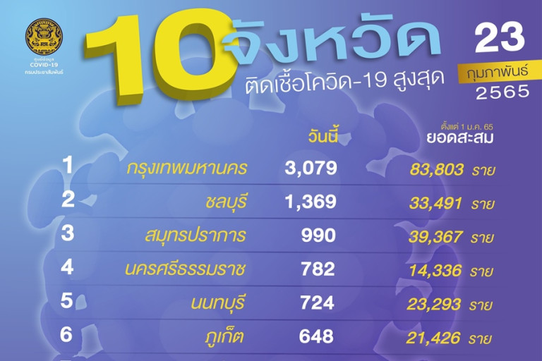 ศูนย์ข้อมูลโควิด-19 รายงานสถานการณ์โรคติดเชื้อไวรัสโควิด-19 ข้อมูล ณ วันที่ 23 ก.พ.65 เวลา 01.00 น. ประเทศไทยยังพบผู้ติดเชื้อรายใหม่ในทุกจังหวัด โดยกทม.พบผู้ติดเชื้อรายใหม่มากที่สุดและเพิ่มขึ้นมากจากเมื่อวานอยู่ที่ 3,079 ราย (จาก 2,638 ราย) ทั้งยังต้องจับตา อันดับ 2 ชลบุรี ที่วันนี้ตัวเลขก้าวกระโดดติดเชื้อใหม่เพิ่มขึ้นในหลักพันอยู่ที่ 1,369 ราย (จาก 929 ราย) รวมทั้งอันดับ 3 สมุทรปราการ และอันดับ 4 นครศรีธรรมราช เพิ่มขึ้นจากเมื่อวานเช่นกัน นอกจากนี้ ยังพบว่า อันดับ 9 และ 10 คือ ระยอง และสุพรรณบุรี ผู้ติดเชื้อรายใหม่ก็เพิ่มขึ้นมากเช่นกัน โดยระยอง อยู่ที่ 481 ราย (จาก 231 ราย) สุพรรณบุรี 474 ราย (จาก 238 ราย) ส่วนอันดับ 5-8 ไล่เรียงตั้งแต่ นนทบุรี ภูเก็ต นครราชสีมา และสมุทรสาคร ผู้ติดเชื้อวันนี้ลดลงเล็กน้อยแต่ยังคงสูงอยู่ ส่วนจังหวัดที่พบผู้ป่วยติดเชื้อรายใหม่น้อยที่สุดคือ แม่ฮ่องสอน 16 ราย