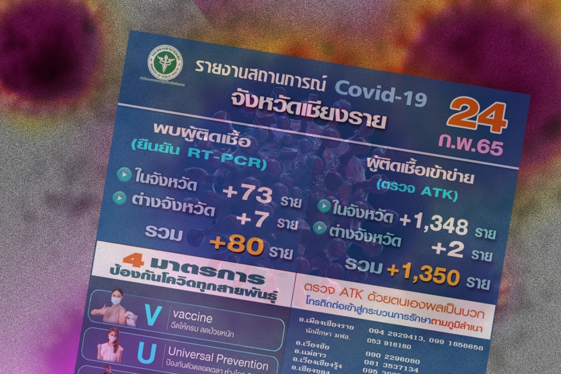 เมื่อวันที่ 24 ก.พ. 2565 สำนักงานสาธารณสุขจังหวัดเชียงราย ได้รายงานสถานการณ์โรคโควิด 19 จังหวัดเชียงราย พบผู้ติดเชื้อตรวจยืนยัน RT-PCR จำนวน 80 ราย โดยพบติดเชื้อภายในจังหวัด 73 ราย ติดเชื้อจากต่างจังหวัด/รับมารักษา 7 ราย จาก จ. เชียงใหม่ 3 ราย กรุงเทพฯ 2 ราย จ.พะเยา 1 ราย และ จ.สมุทรสาคร 1 ราย