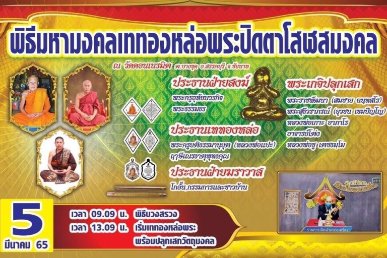 ในวันเสาร์5 เดือนมีนาคม พ.ศ.2565 วันมหามงคลที่จะถึงนี้มีพิธีเททองหล่อพระปิดตาโสฬสมงคลหน้าตัก29นิ้วองค์แรกและครั้งแรกในประเทศไทยที่มีการหล่อพระปิดตา ณ วัดดอนเนรมิต ต.บางขุด อ.สรรคบุรี จ.ชัยนาท มีพระเกจิอาจารย์หลายท่านเข้าร่วมพิธีเททองปลุกเสกดังนี้ พระครูอุทัยบวรกิจ พระธรรมธร(หลวงปู่ตี๋) เป็นประธานฝ่ายสงฆ์ พระครูยติธรรมานุยุต(หลวงพ่อแป๊ะ)และฤาษีเณรธาตุพุทธคุณเป็นประธานเททองหล่อ โกอั้น,กรรมการและชาวบ้านเป็นประธานฝ่ายฆราวาส โดยมีพระเกจิอาจารย์ร่วมปลุกเสกดังนี้ พระราชพัฒนา, พระสุธีวราภรณ์, หลวงพ่อเกาะ อาภาโร, อาจารย์โต่ง, หลวงพ่อชู เตชธมุโม และ หลวงพ่อแม้น วัดหน้าต่างนอก โดยในเวลา 9.09 น. พิธีบวงสรวง เวลา13.09 น.เริ่มเททองหล่อพระพร้อมปลุกเสกวัตถุมงคล และในงานมหามงคลครั้งนี้จะมีแจกพระปิดตาโสฬสมงคลจำนวน700องค์ฟรีแด่ผู้ที่เข้ามาร่วมพิธี