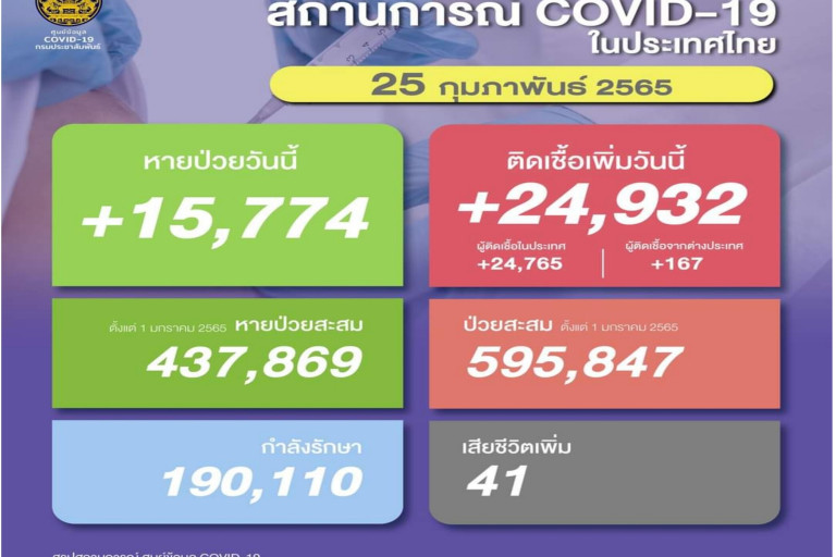 วันที่ 25 ก.พ.2565 ศูนย์ข้อมูล COVID-19 รายงานยอดผู้ติดเชื้อโควิด-19 รายใหม่จำนวน 24,932 ราย จำแนกเป็น ติดเชื้อในประเทศ 24,765 ราย ติดเชื้อจากต่างประเทศ 167 ราย ทำให้ยอดผู้ป่วยสะสมตั้งแต่ 1 มกราคม 2565 มีจำนวน 595,847 ราย หายป่วยกลับบ้าน 15,774 ราย เสียชีวิต 41 ราย รวมเสียชีวิตสะสมตั้งแต่ ปี 2563-ปัจจุบัน จำนวน 22,809 ราย