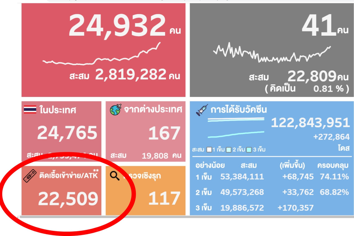กรมควบคุมโรค กระทรวงสาธารณสุข รายงานข้อมูลผลการตรวจ ATK วันที่ 25 ก.พ.65 เวลา 07.29 น. พบผลตรวจ ATK เป็นบวกเพิ่มขึ้นสูงสุดในรอบปีนี้และสูงเป็นประวัติการณ์ที่ 22,509 ราย ขณะที่จำนวนผู้ติดเชื้อรายใหม่อยู่ที่ 24,932 ราย จึงทำให้ยอดผู้ติดเชื้อรายใหม่อย่างไม่เป็นทางการอยู่ที่ 47,441 ราย