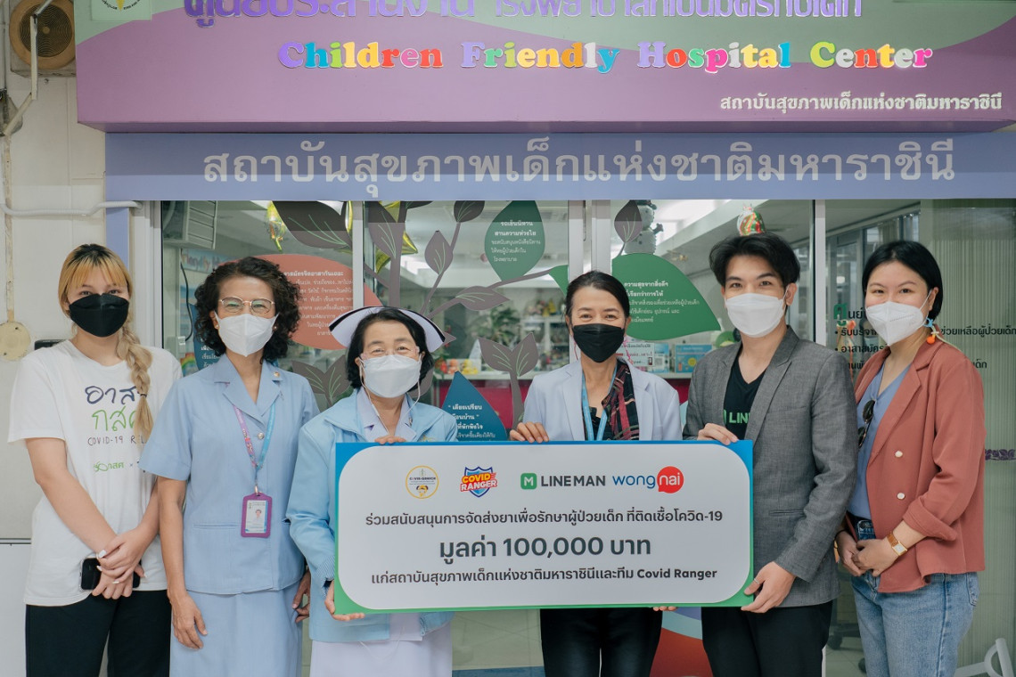 LINE MAN เดินหน้าช่วยเหลือผู้ป่วยโควิด-19 ผ่าน สถาบันสุขภาพเด็กแห่งชาติมหาราชินี (รพ.เด็ก) และทีม Covid Ranger โดยมอบโค้ดส่วนลดสำหรับค่าขนส่งยารักษา มูลค่ารวม 1 แสนบาท ในการเรียกใช้บริการไรเดอร์จาก LINE MAN เพื่อจัดส่งยาถึงบ้านผู้ป่วยเด็กที่ติดเชื้อโควิด-19 ในการดูแลของโรงพยาบาลเด็ก ที่ทำการแยกกักตัวรักษาที่บ้านหรือ Home Isolation โดย พงศ์วิชญ์ คงเจริญ ผู้จัดการฝ่ายประชาสัมพันธ์ LINE MAN Wongnai เป็นตัวแทนมอบทุนสนับสนุนค่าส่งยาแก่ รศ.พญ.วารุณี พรรณพานิช วานเดอพิทท์ หัวหน้างานโรคติดเชื้อ สถาบันสุขภาพเด็กแห่งชาติมหาราชินี จุฑานันท์ จรรยาลิขิต ตัวแทนทีม Covid Ranger ซึ่งทาง LINE MAN Wongnai เล็งเห็นปัญหาการระบาดของเชื้อโควิด-19 ในวัยเด็กที่สูงขึ้น จึงทำการสนับสนุนและให้ความช่วยเหลือแก่โรงพยาบาลเด็กและทีม Covid Ranger เพื่อให้ทุกคนผ่านพ้นวิกฤติการระบาดในครั้งนี้ไปด้วยกัน