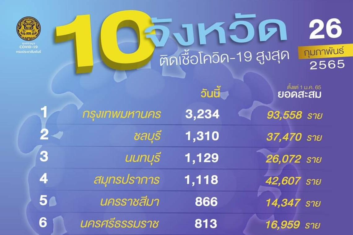 ศูนย์ข้อมูลโควิด-19 รายงานสถานการณ์โรคติดเชื้อไวรัสโควิด-19 ข้อมูล ณ วันที่ 26 ก.พ.65 เวลา 01.00 น. พบว่าสถานการณ์โรคติดเชื้อโควิดของไทยเพิ่มสูงขึ้น โดยยังคงพบผู้ติดเชื้อรายใหม่ในทุกจังหวัด ซึ่งใน 10 อันดับจังหวัดติดเชื้อสูงสุด กทม.ยังครองอันดับ 1 ทั้งผู้ติดเชื้อรายใหม่สูงสุดและยอดผู้ติดเชื้อสะสมสูงที่สุดเริ่มเข้าใกล้หลักแสนรายในปีนี้ โดยล่าสุดกทม.พบผู้ติดเชื้อรายใหม่ลดลงอยู่ที่ 3,234 ราย (จาก 3,285 ราย) เช่นเดียวกับหลายจังหวัด ยกเว้น นนทบุรี ขยับขึ้นจากอันดับ 5 เป็นอันดับ 3 จำนวน 1,129 ราย(จาก 775 ราย) และ นครปฐม ขึ้นจากอันดับ 9 เป็นอันดับ 7 จำนวน 793 ราย เพิ่มขึ้น(จาก 649 ราย)อันดับ 2 ชลบุรี ลดลงมากจากเมื่อวานเช่นกันที่ 1,310 ราย (จาก 1,419 ราย) อันดับ 4 สมุทรปราการ ลดลง 1,118 ราย (จาก 1,128 ราย) อันดับ 5 นครราชศรีมา ลดลง 866 ราย(จาก 644 ราย) อันดับ 6 นครศรีธรรมราช ลดลง 813 ราย(จาก 911 ราย) อันดับ 8 ราชบุรี 770 ราย(จาก 738 ราย) อันดับ 9 ภูเก็ต 698 ราย(จาก 684 ราย) อันดับ 10 พระนครศรีอยุธยา 692 ราย ส่วนจังหวัดที่ไม่พบผู้ติดเชื้อรายใหม่ คือ ลำปาง